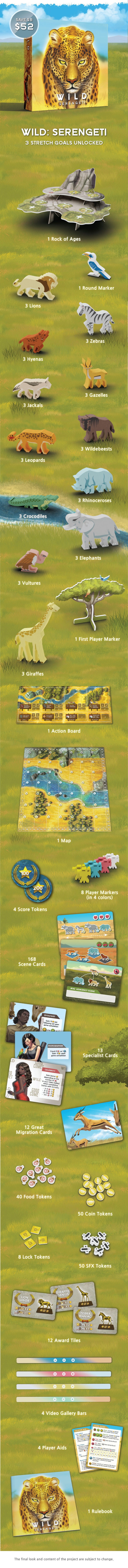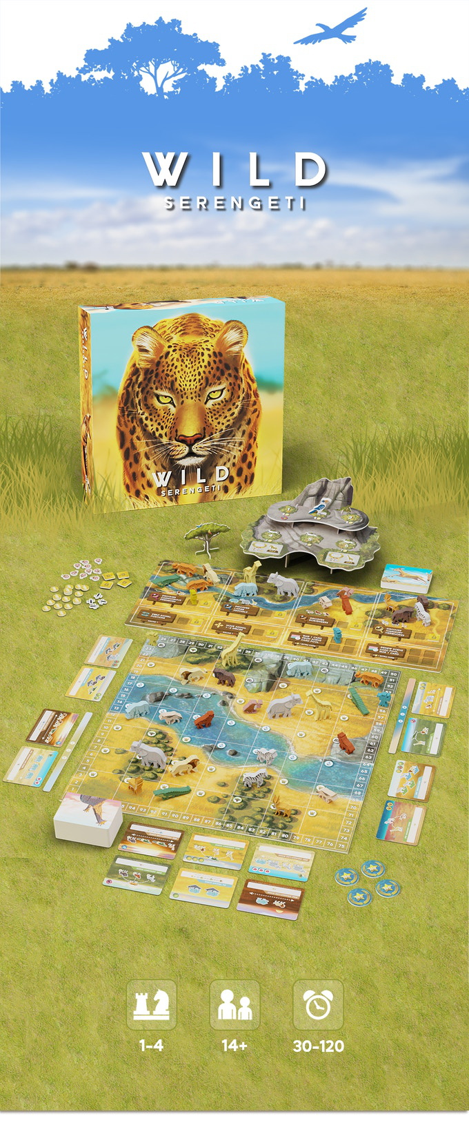 WILD: Serengeti is a board game inspired by the endless plains of the Serengeti. This game combines the joy of puzzle-solving with elements of set-collection and engine-building to create a deep and unique strategic experience. The mesmerizing artwork, 3D components and detailed animeeples will guide you straight into the vivid and breathtaking wilds of the Serengeti.
