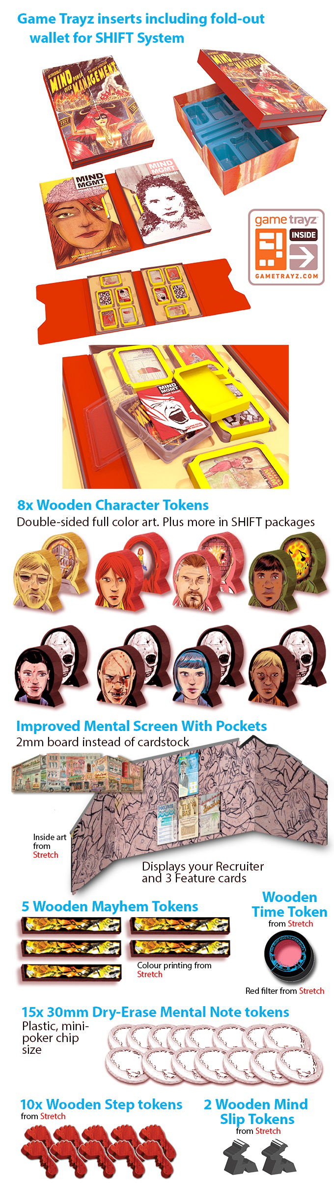 - Wooden character tokens, Step tokens, Mind Slip tokens, and Mayhem tokens