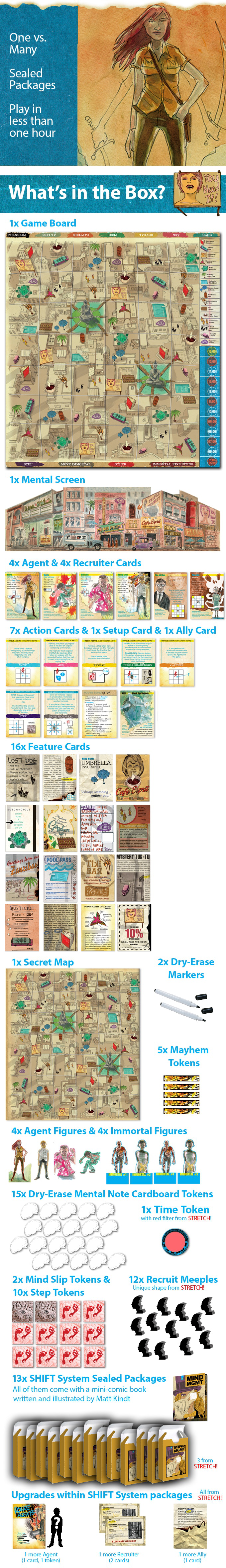In Mind MGMT: The Psychic Espionage "Game.", one player controls Mind MGMT and must scour the city for new recruits. They move around on a secret map, trying to visit locations that match one of their three randomly drawn feature cards. They can also use their four Immortals to protect locations from being exposed.