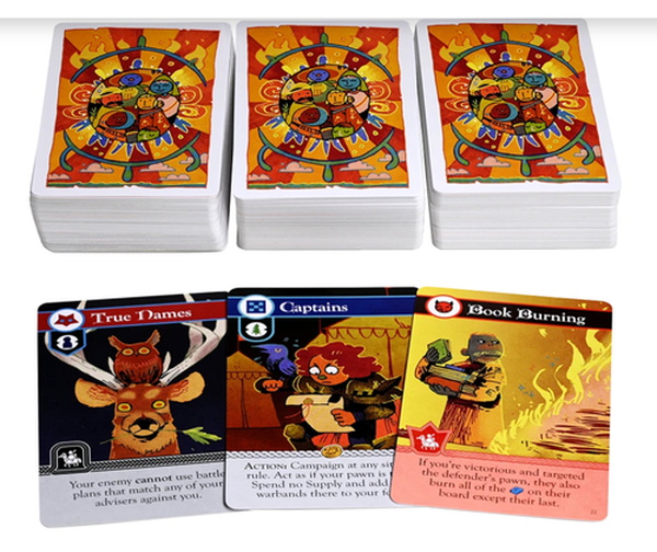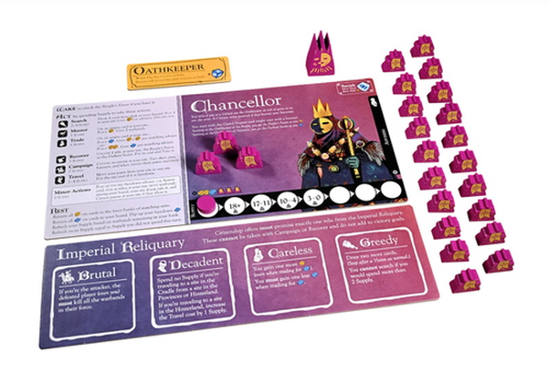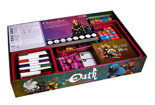 In Oath, one to six players guide the course of history in an ancient land. Players might take the role of agents bolstering the old order or scheme to bring the kingdom to ruin. The consequences of one game will ripple through those that follow, changing what resources and actions future players may have at their disposal and even altering the game's core victory condition.