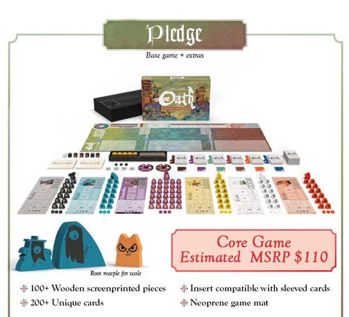 In Oath, there are no fancy production tricks, app-assisted mechanisms or production gimmicks. The game can be reset at any time and doesn't require the same play group from one game to the next. A player might use the fully-featured solo mode to play several generations during the week and then use that same copy of the game for Saturday game-night with friends. There are no scripted narratives or predetermined end points. The history embedded in each copy ofOathwill grow to be as unique as the players who helped build it.