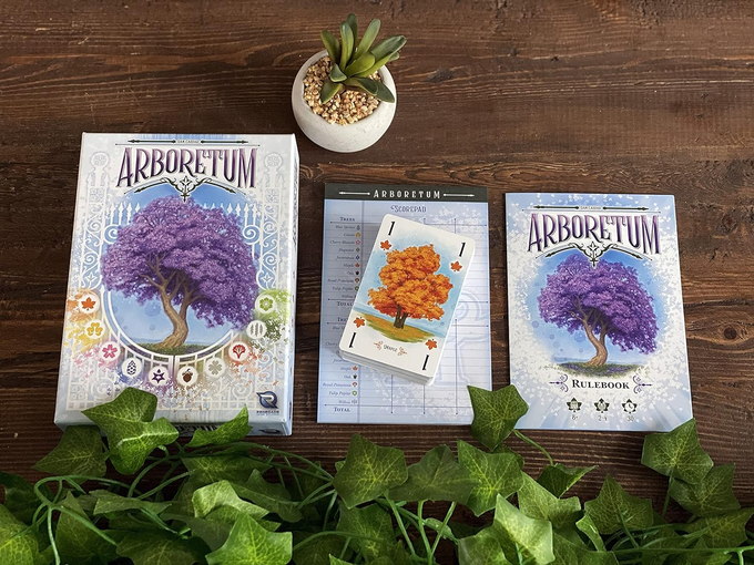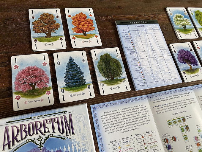 The deck has 80 cards in ten different colors, with each color featuring a different species of tree; each color has cards numbered 1 through 8, and the number of colors used depends on the number of players. Players start with a hand of seven cards. On each turn, a player draws two cards (from the deck or one or more of the discard piles), lays a card on the table as part of her arboretum, then discards a card to her personal discard pile.