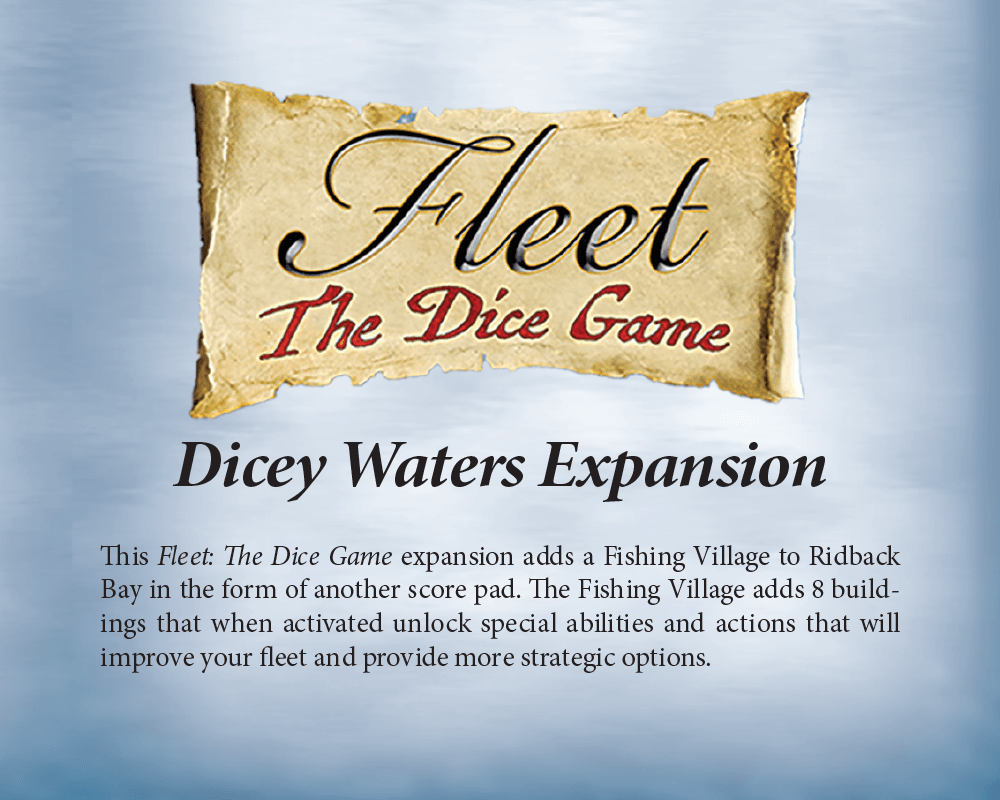Fleet: The Dice Game - Dicey Waters Expansion adds a new full color mini-scorepad to the game with 8 new buildings in a fishing village. Each building offers a new advantage or tactic, but the only way to check a box in the fishing village is by using any die as a coin and not using the die face i.e. "passing".