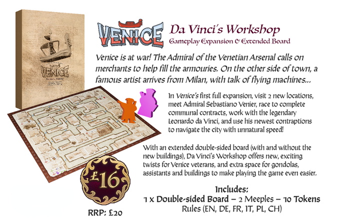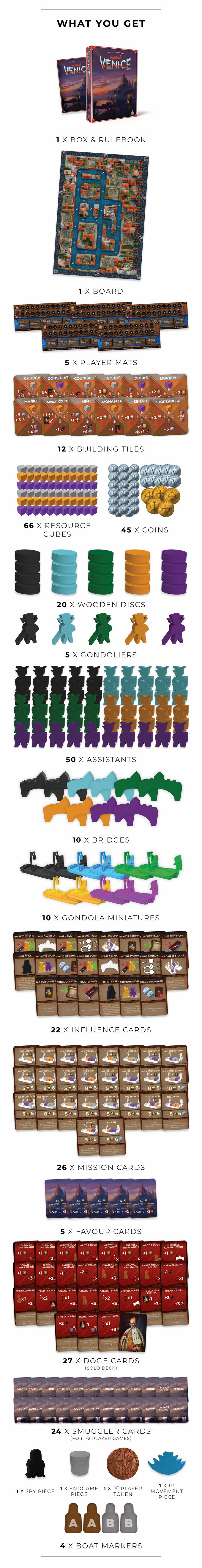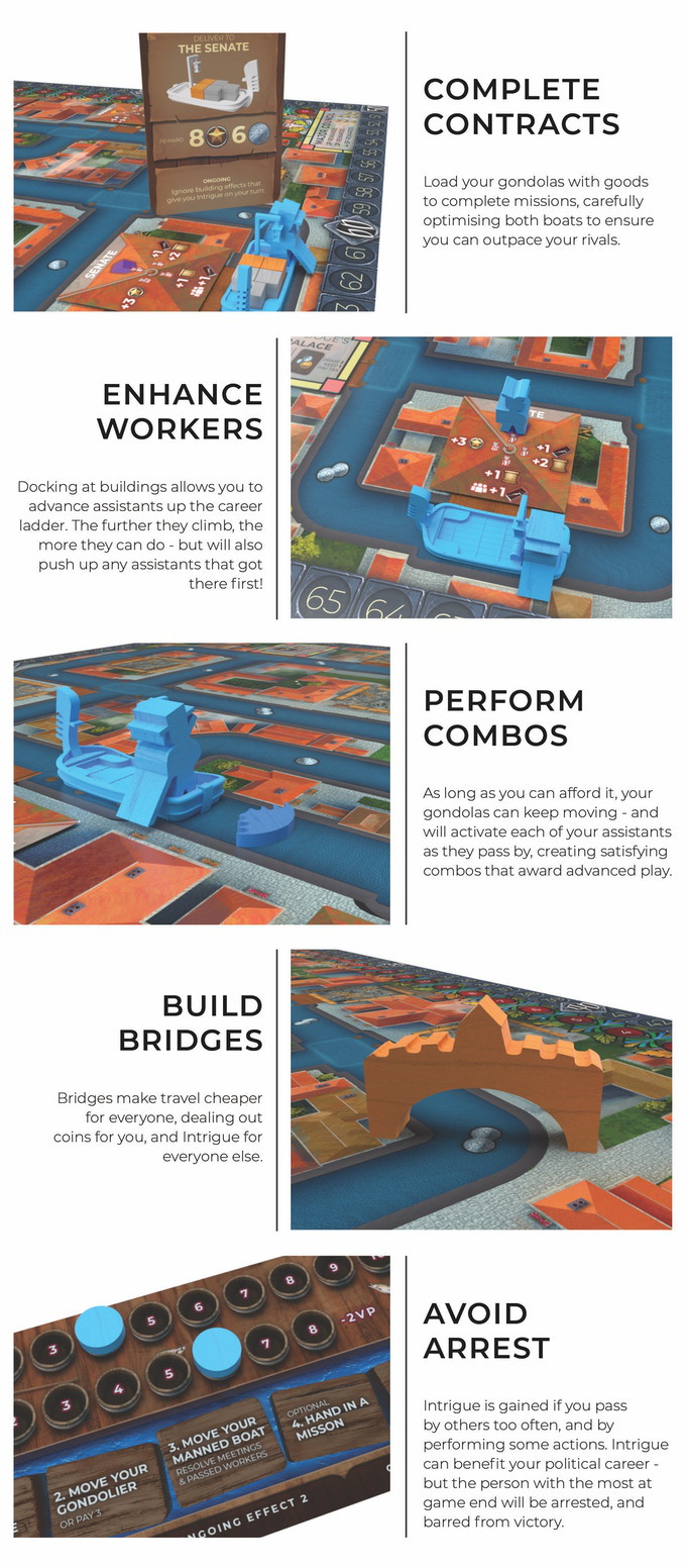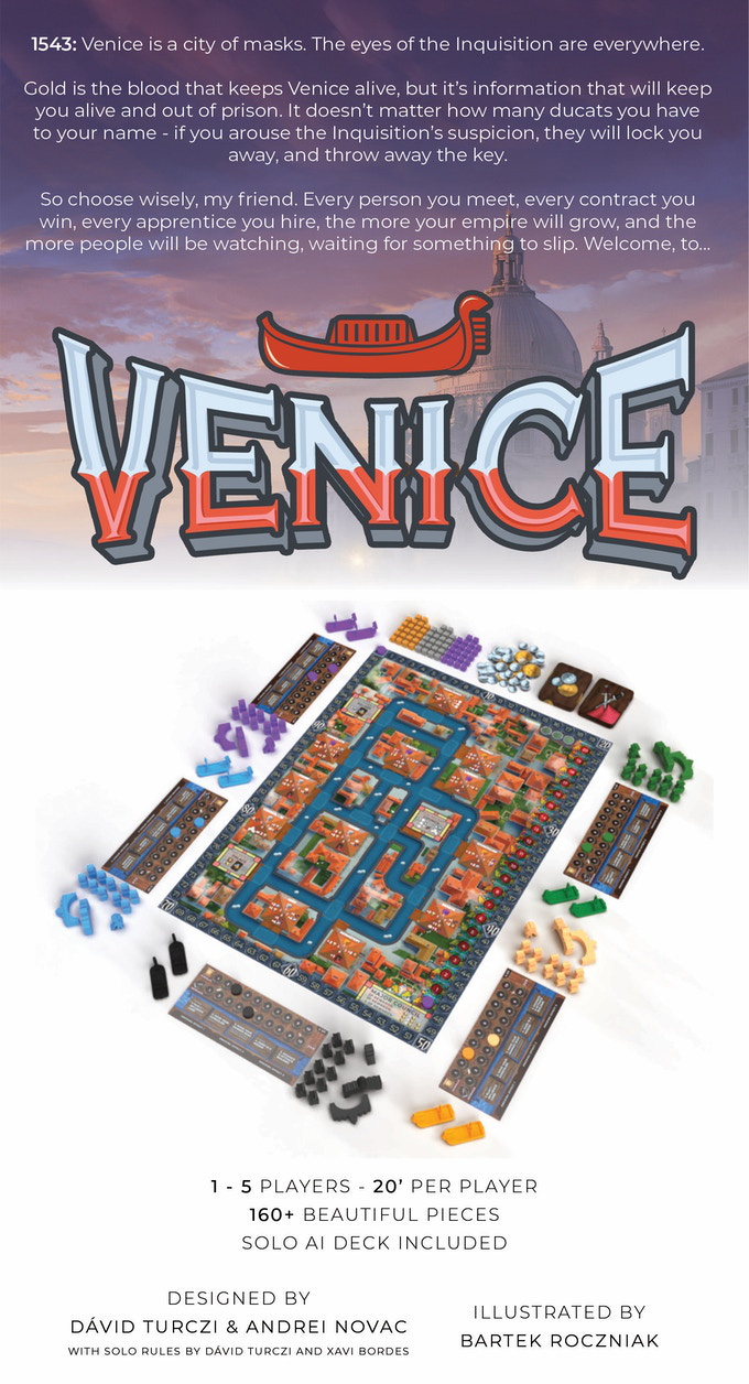 Set in the titular city in the 16th century, Venice lets players take the role of wealthy, influential merchants as they ride their gondolas up and down the city's canals, train their assistants, complete contracts, and leverage their influence to gain political power. But business is anything but usual. As they broker contracts and flirt with crime, merchants must avoid arousing the suspicion of the Venetian Inquisition, lest they find themselves arrested and their businesses shut down.