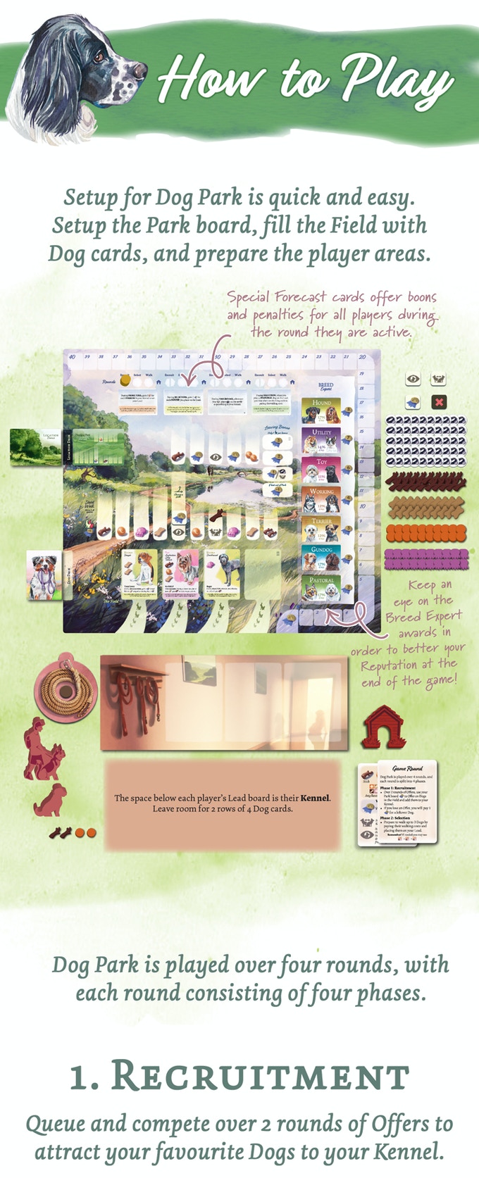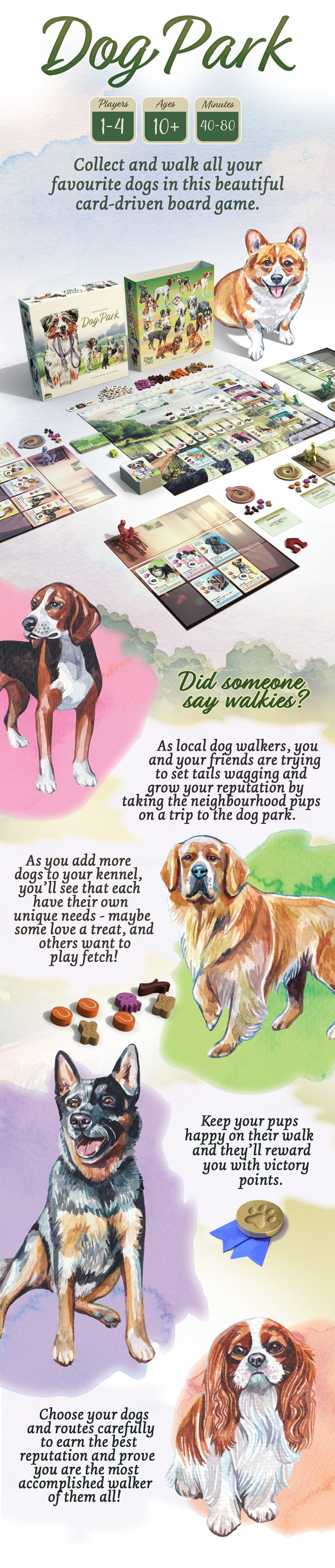 Welcome to Dog Park, a mid-weight, competitive set-collection and point-to-point movement game in which players take on the role of dog walkers who recruit, walk, and care for their dogs over four rounds. Each round is split into four phases: