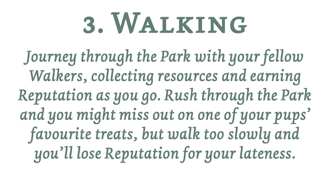 - Walking Phase: Players journey through the dog park with their fellow walkers, collecting resources, earning reputation, and interacting with other walkers.