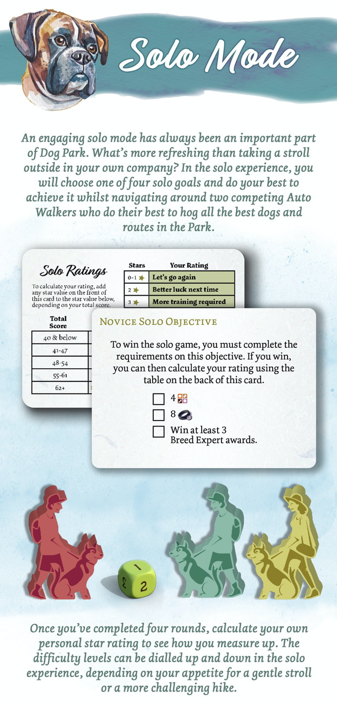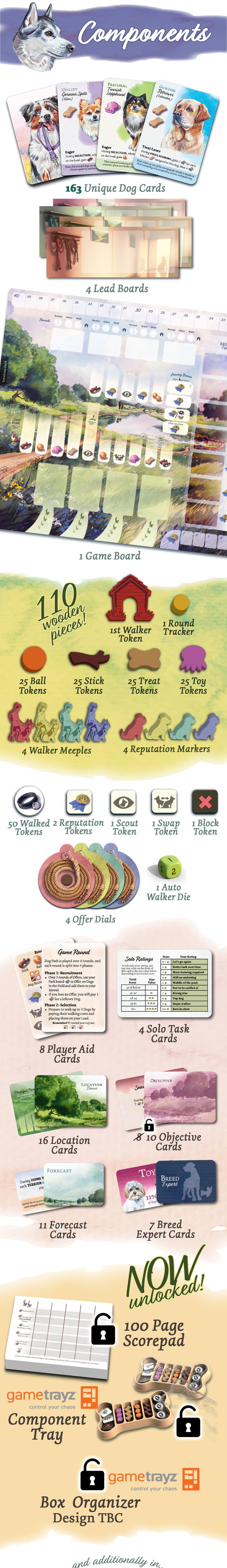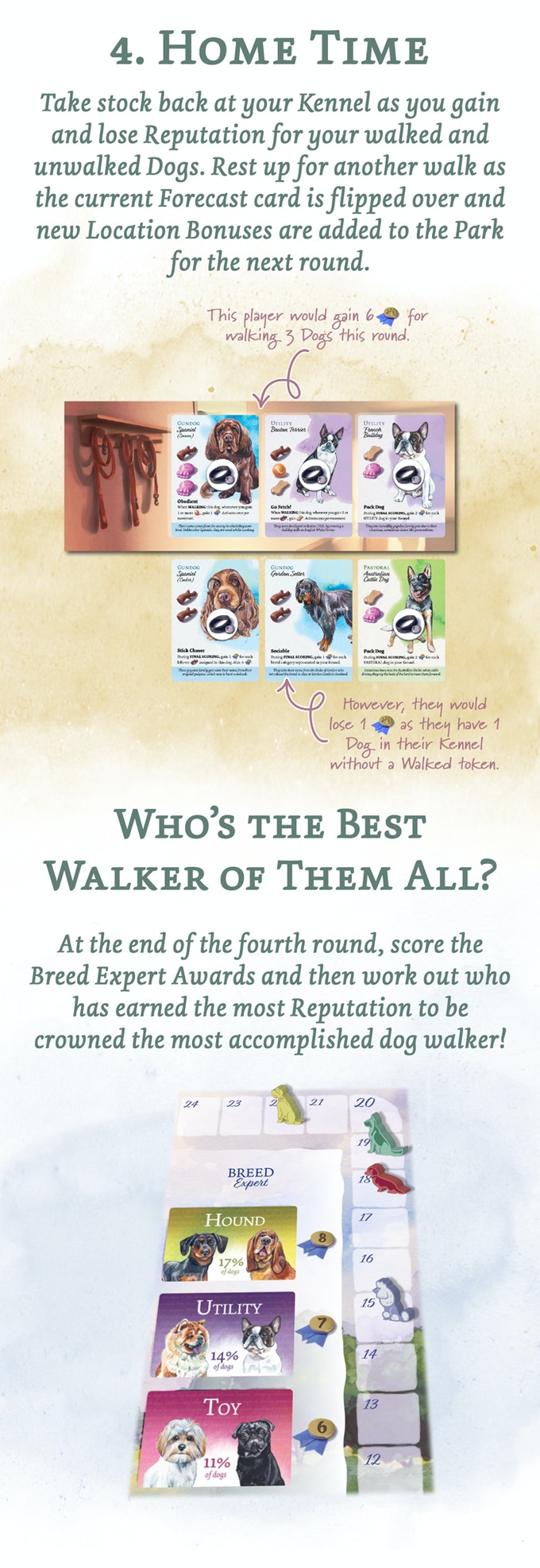 Players must choose their routes and dogs carefully to earn the best reputation and prove they are the most accomplished walker of them all. At the end of the game, the player with the most reputation wins.