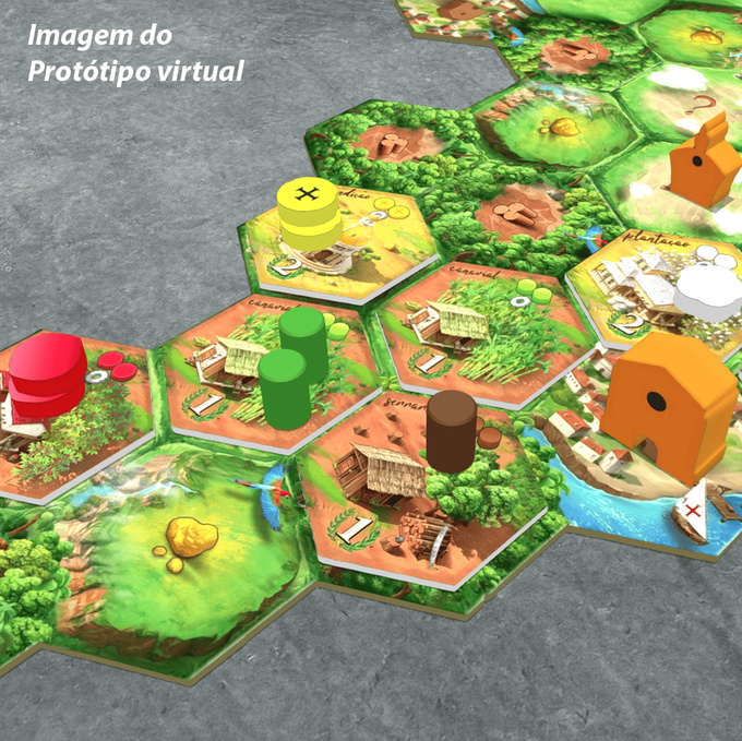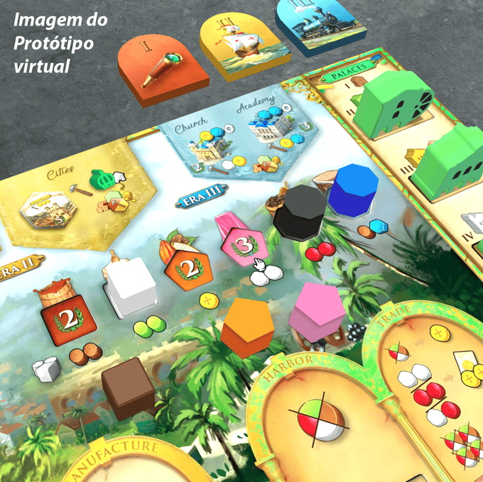 In more detail, while playing on a modular board, you use a combination of worker placement, area majority, and individual powers to construct an empire in Brazil between the 16th and 19th centuries. You start by choosing one of the available monarchs and its personal game board and components; some monarchs are strong in combat, while others prioritize science or exploration. You receive tasks that advance you to a new era when you complete them, giving you access to more power constructions as you move into the second and third eras of the game, then you choose a starting point on the shared map.