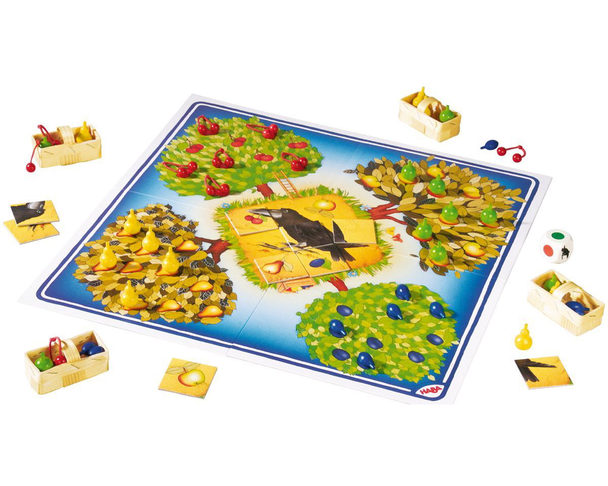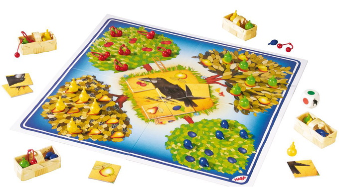 Only a quick harvesting of the trees carrying crunchy cherries, juicy apples, sweet pears and marvellous plums prevents the snitching of fruits by the impudent and insatiable raven. All players work together to harvest the fruits.