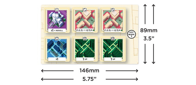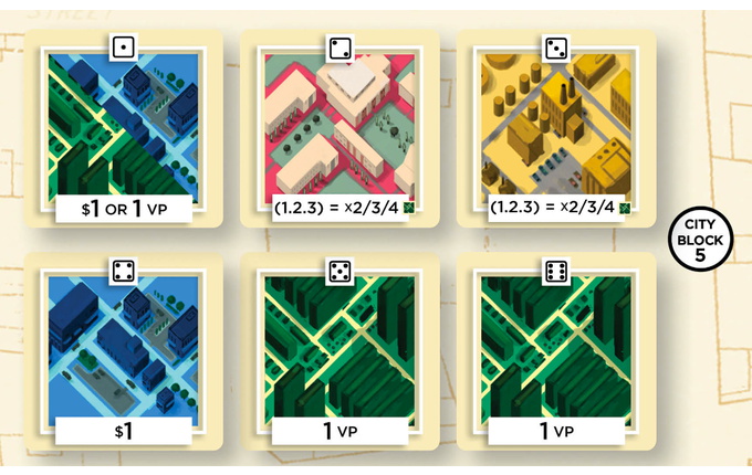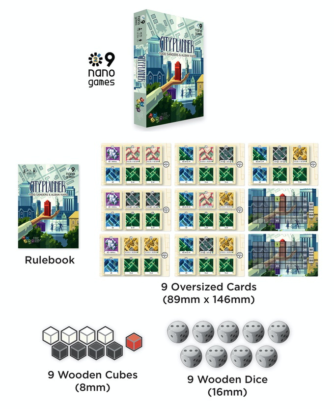 City Planner is a 9 cards, 9 cubes, 9 dice version of Town Center mixed with Card City and dice. Your Small City is divided into several blocks that contain different boroughs (Residential, Commerce, Industry, Cultural Buildings, City Hall or mixed zoning of Residential and Commerce).