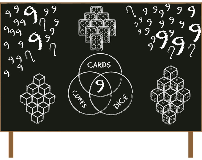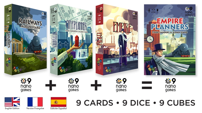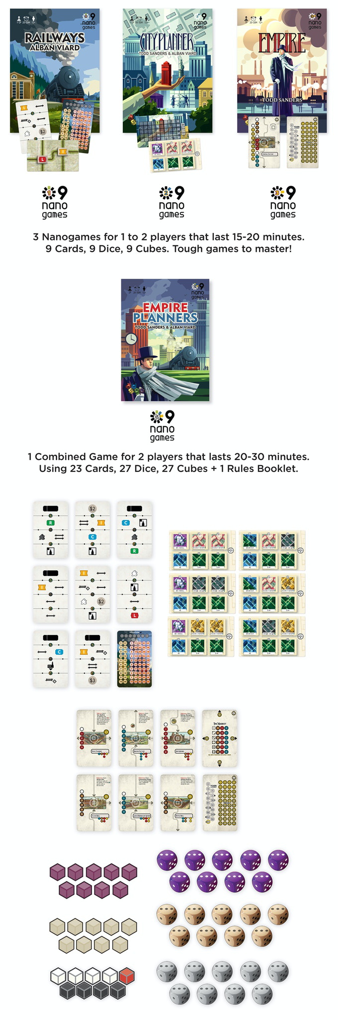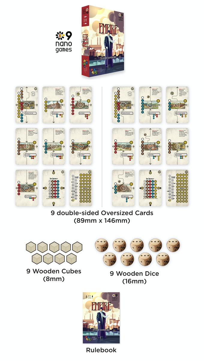 A Nano9Game is a game that only contains 9 Cards, 9 Dice and 9 Cubes. Nano means something tiny!