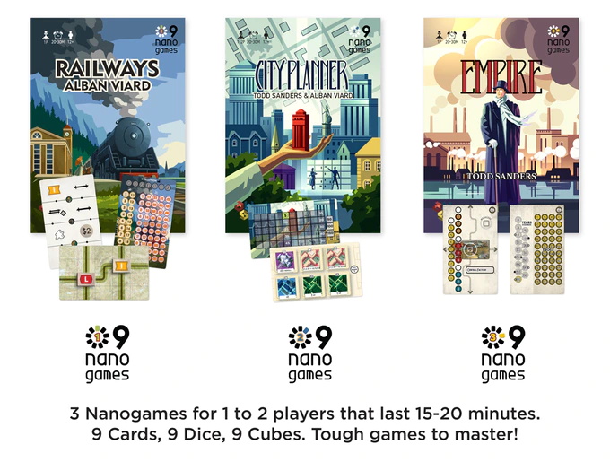 Three Nano9Games for 1-2p with minimalistic components, but tough to master using only 9 cards, 9 cubes and 9 dice