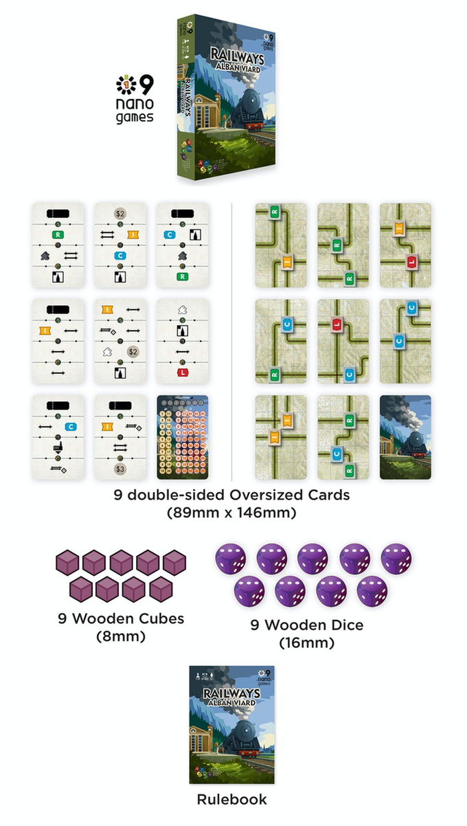 Railways is a pickup and deliver game with only 9 cards, 9 dice and 9 cubes!
