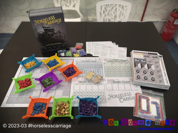 Horseless Carriage is a game about the dawn of the automobile: a time when cars were invented, and no one quite knew yet what this new contraption would look like, and what features would be essential. Early cars sometimes used levers or pedals to steer and a wheel to accelerate. Brakes were not always seen as essential; but sometimes an outside spot to take along an onboard mechanic was. This early, super innovative period occurs in the development of many new product categories. Players are cast as aspiring industrialists trying to find out what features the public will value when buying these new, expensive, and utterly unfamiliar horseless carriages.