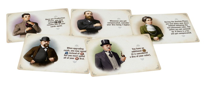 The game is played over four rounds, and each round consists of two phases: Auction and Production. During the auction, 6-8 company cards are laid out with their basic sides face up. Players take turns placing one of their discs on one of these cards, but you cannot place a disc on a card if a disc of the same value or color is already present. Thus, you'll place discs on four cards.