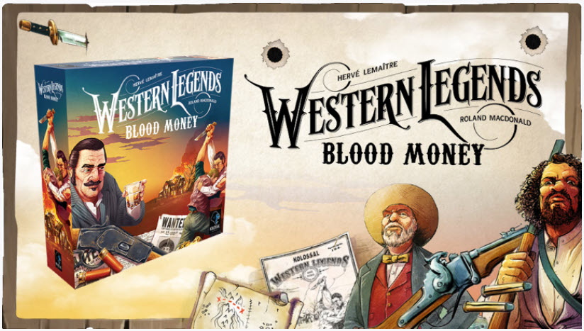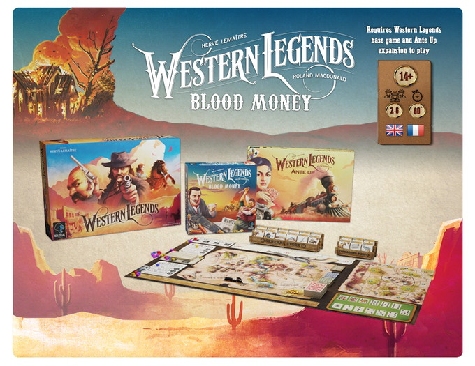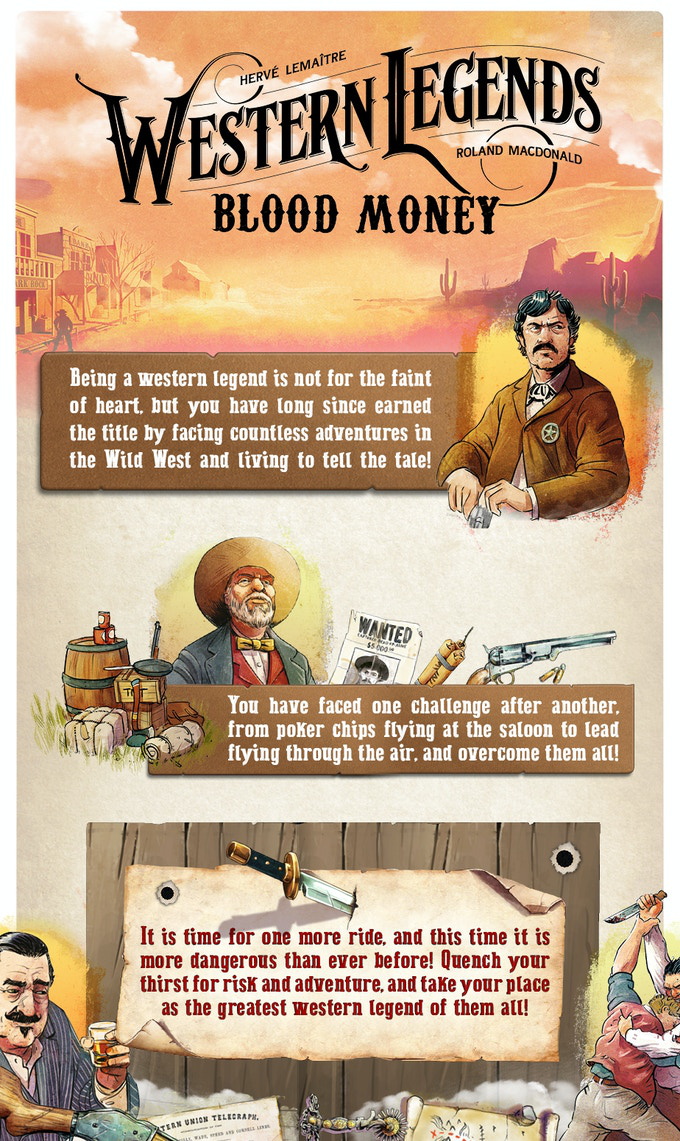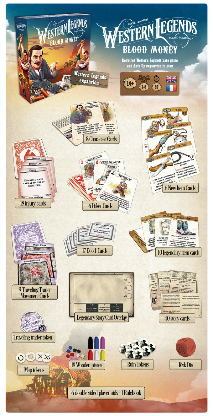 Blood Money is the second large expansion for Western Legends, introducing a number of modules to tailor every game. The risk module uses a die that improves a number of actions... at the risk of injury. The legendary story module incorporates the story track and high-reward adventures for players to pursue. Players may now purchase deeds to locations and legendary items from the traveling trader. And of course, there is a bevy of new characters and items to explore!