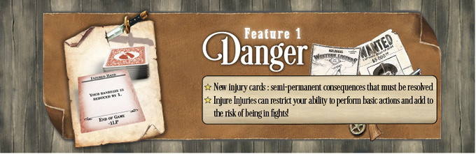 Fans of Western Legends have long been calling for a more dangerous feel to the game with greater consequences for wounds than just reduced hand size and loss of Legendary points at the end of the game. We listened, and Western Legends: Blood Money adds injury cards to the mix. If a player would gain wounds in excess of the maximum number they must take an injury card, if they do not already have one.