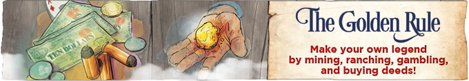 “The Golden Rule” game mode consists of some of the characters that are best suited to making their legend by mining, ranching, gambling, and buying deeds! “The Golden Rule” game mode also makes use of items, story cards, and special rules best suited for a game where players try to become the most legendary tycoon in the Old West!