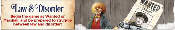 The ”Law and Disorder” game mode focuses on characters that begin the game Wanted or as Marshals and the struggle between law and disorder! “The Law and Disorder” game mode also makes use of item setup, story cards, and special rules best suited for a game that highlights the stark conflict between those who uphold the law and those determined to break it!