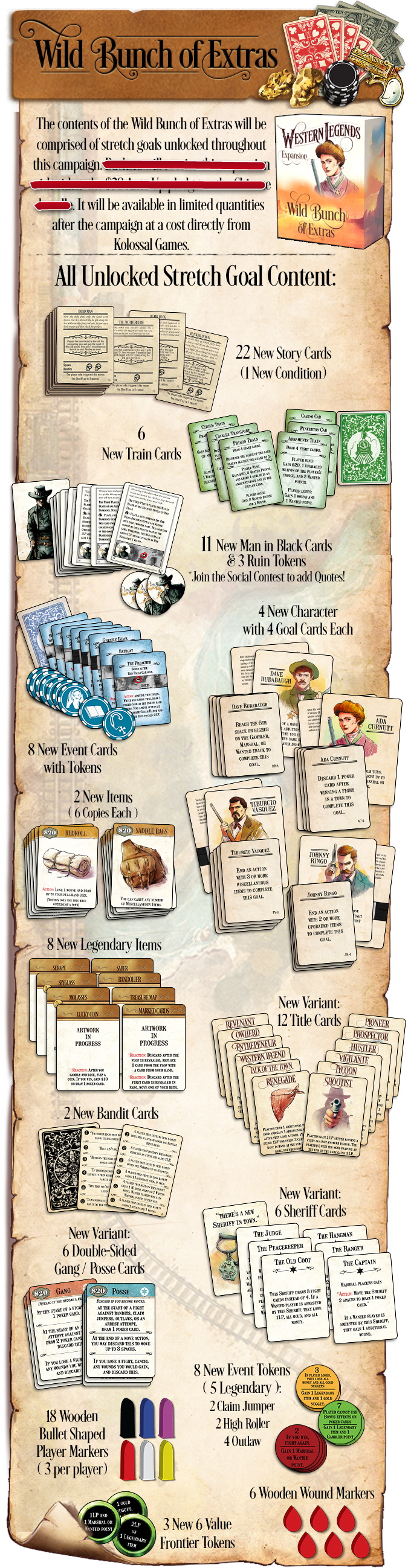The Wild Bunch of Extras expansion includes all the unlocked stretch goal content unlocked during the 2019 Kickstarter for Western Legends: Ante Up. Complete with new variants, characters, deluxe components, and an expanded card pool to add even more options and variety to your games!