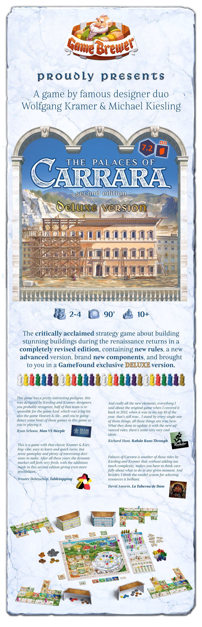 This second edition includes a revised set of rules, as well as a completely new advanced version that will include many new strategies and ways of scoring. This new advanced mode of play introduces statues, which will allow you to score your buildings in a multitude of new ways. So come and revisit this classic game by famous designers Wolfgang Kramer and Michael Kiesling.