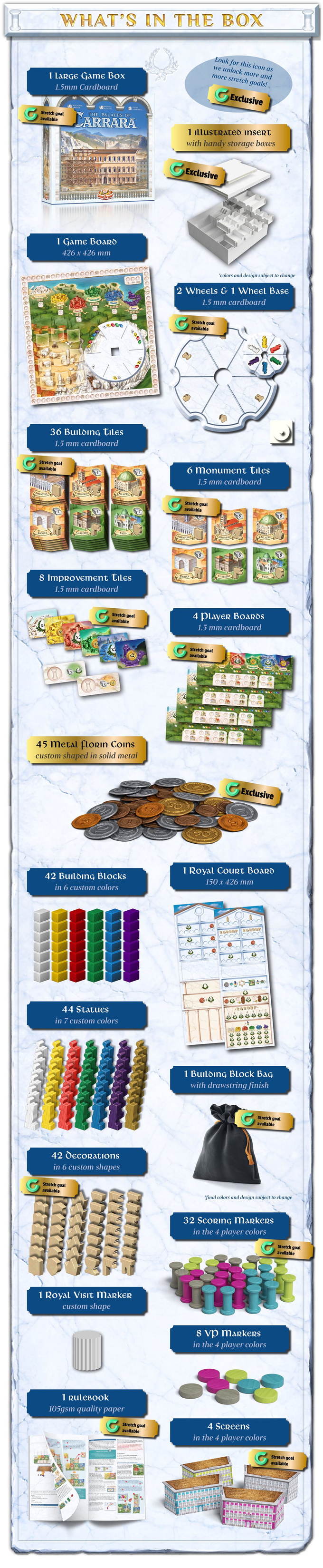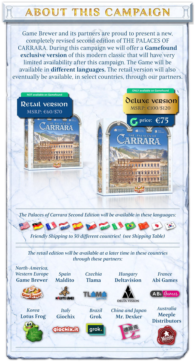 In The Palaces of Carrara, players want to buy the marble from this famous region of Italy as cheaply as possible – but any reduction in price will benefit your opponents as well. Maybe you'll find it profitable to instead invest in the buildings created from this exclusive marble? Maybe it'll be more worthwhile to grab the expensive raw material when bigger buildings in town turn out to be not as lucrative as you'd hoped?