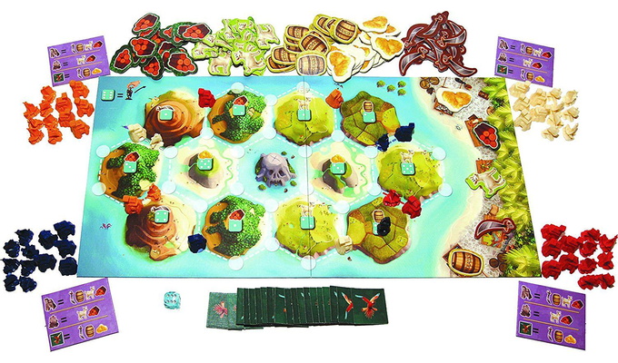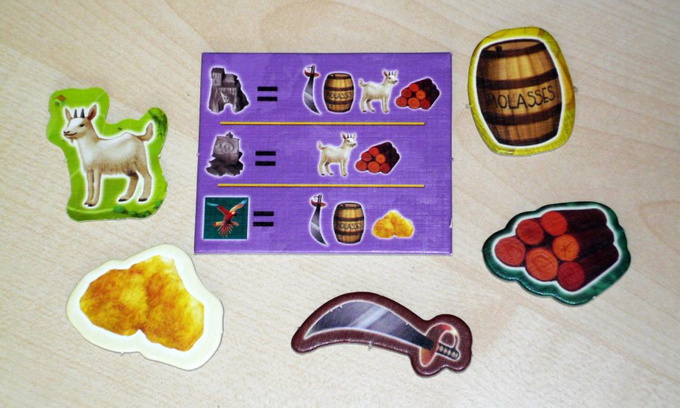 CATAN experts will easily recognize that many essential elements of the CATAN base game are included in CATAN Junior, although - in accordance with the theme - they received different names: pirates' lairs are built adjacent to islands, and if the islands' numbers are rolled, the players receive resource tiles. The resource tiles depict gold, goats, wood, molasses, and cutlasses.