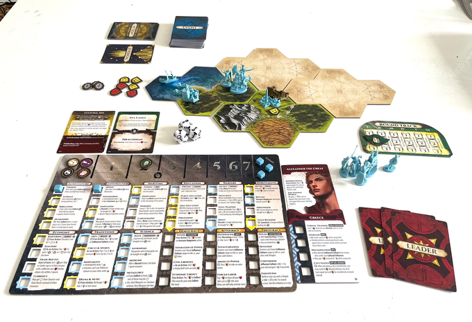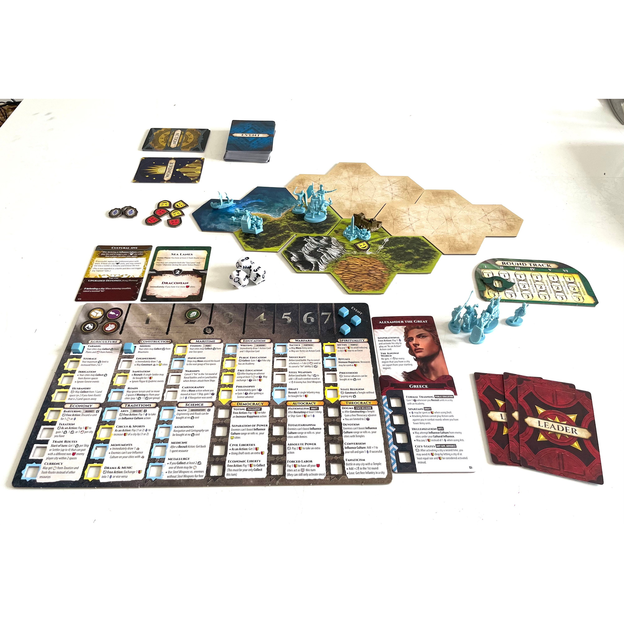 In Clash of Cultures, each player leads a civilization from a single settlement to a mighty empire. Players must explore their surroundings, build large cities, research advances and conquer those who stand in the way. The game features a modular board for players to explore, 48 distinct advances, seven mighty wonders, and loads of miniatures and cards. The winner will create a culture that will be remembered and admired for millennia.