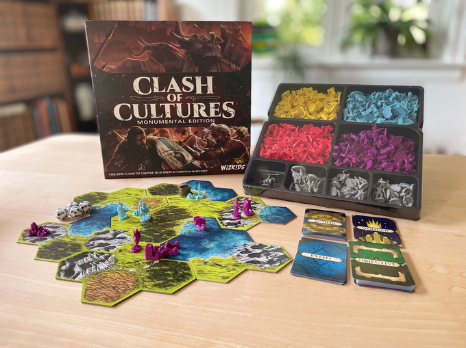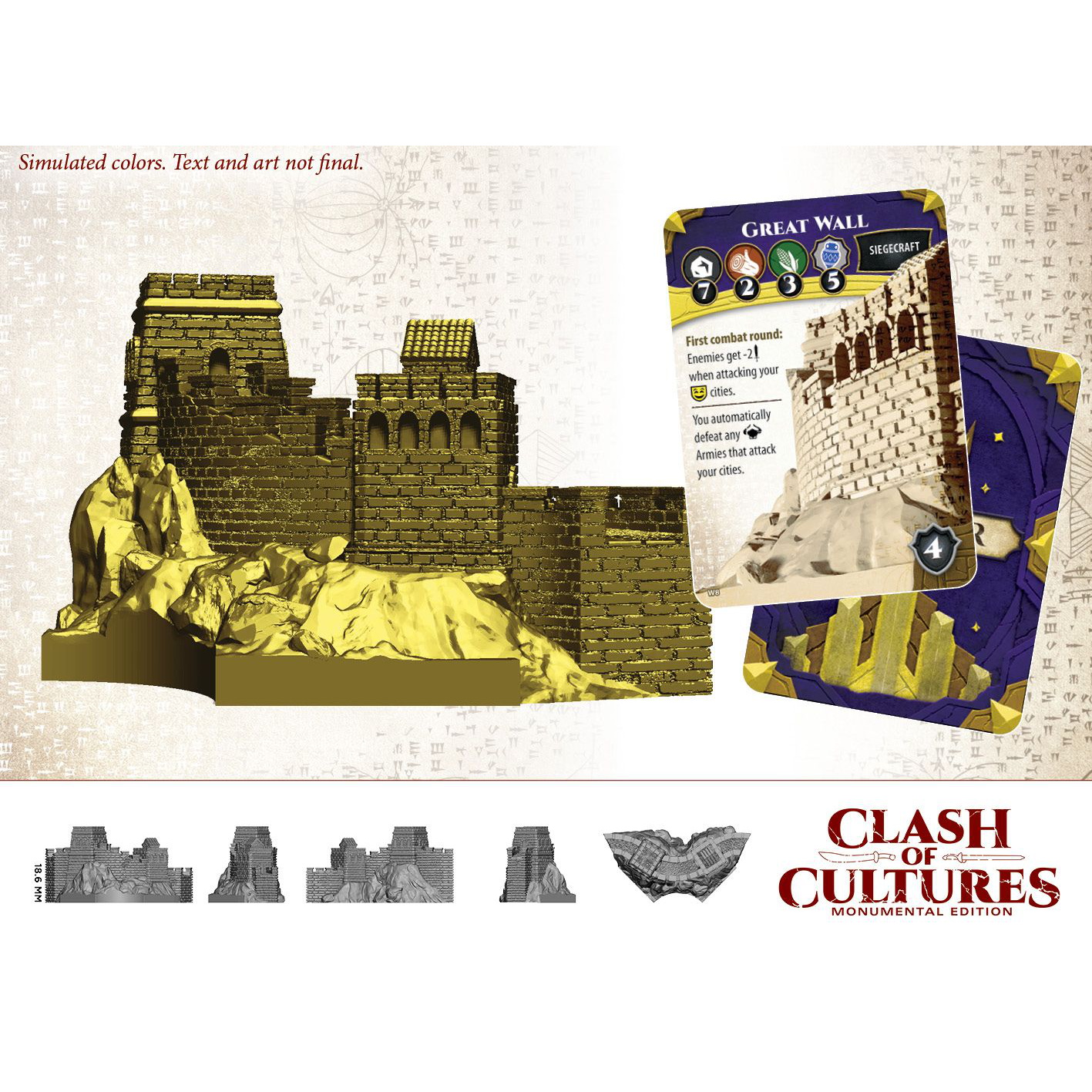 Clash of Cultures: Monumental Edition brings back the classic game of exploration, expansion, and development with the Clash of Cultures base game and the Civilizations and Aztecsexpansions in one box! Grow your civilization, advance your culture and tech, and leave your mark by building wonders, with this edition of the game including fully-sculpted miniatures of the Seven Wonders.