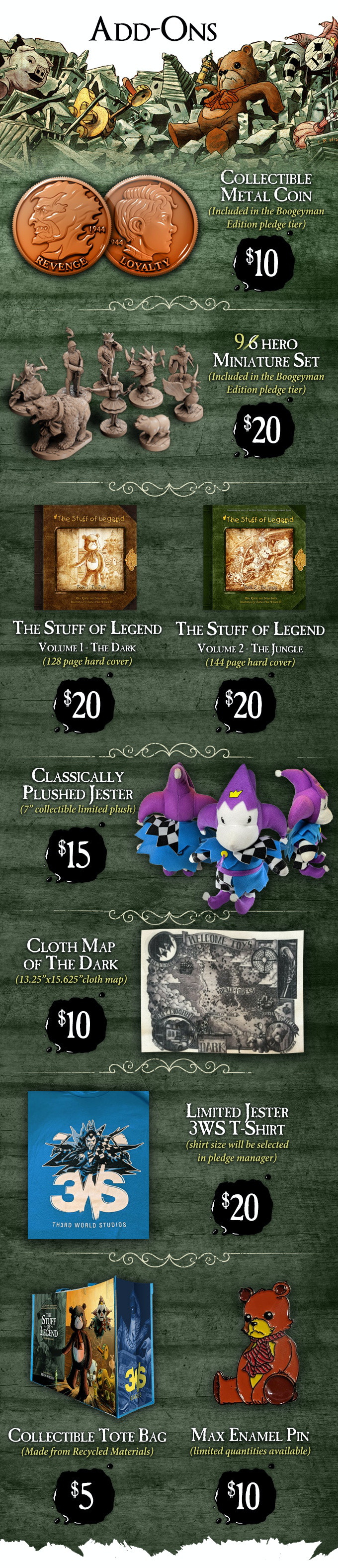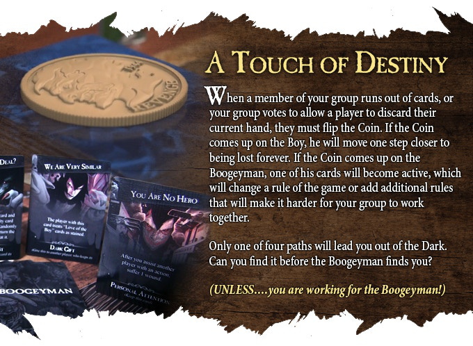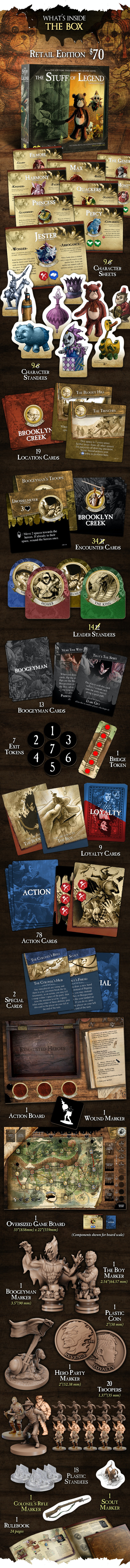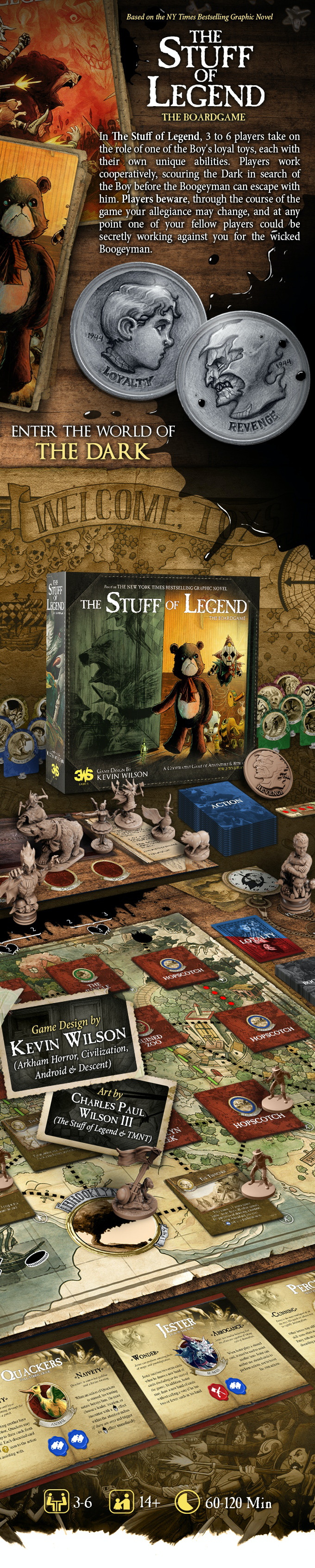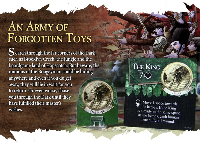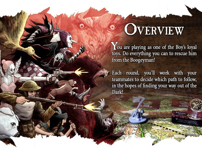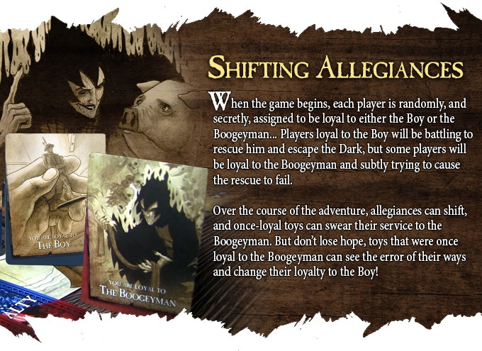 In The Stuff of Legend, each player takes on the role of one of the boy's loyal toys, each with their own unique abilities. Players work co-operatively, scouring the Dark in search of the Boy before the Boogeyman can escape with him. Players beware, through the course of the game your allegiance may change, and at any point one of your fellow players could be secretly working against you for the wicked Boogeyman.