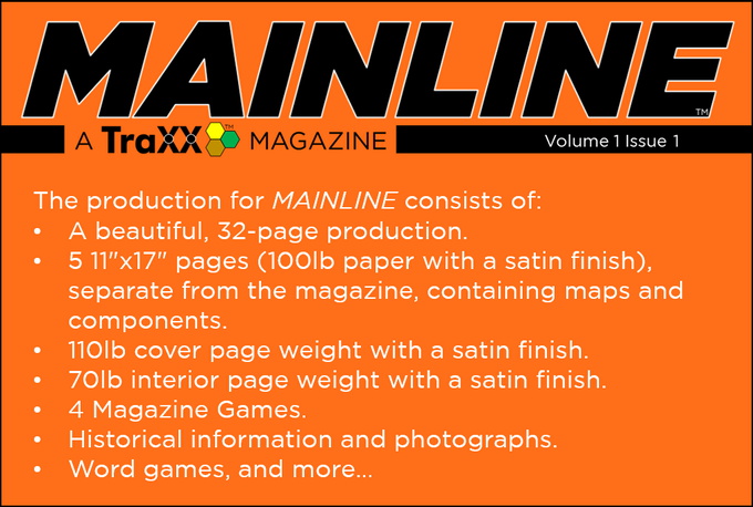 MAINLINE Magazine, by TraXX, is a semi-annual magazine which brings a unique mixture of railroad-themed board gaming action and historical information to the train gaming community. Each issue features a theme which is reflected in the games and historical information contained within.