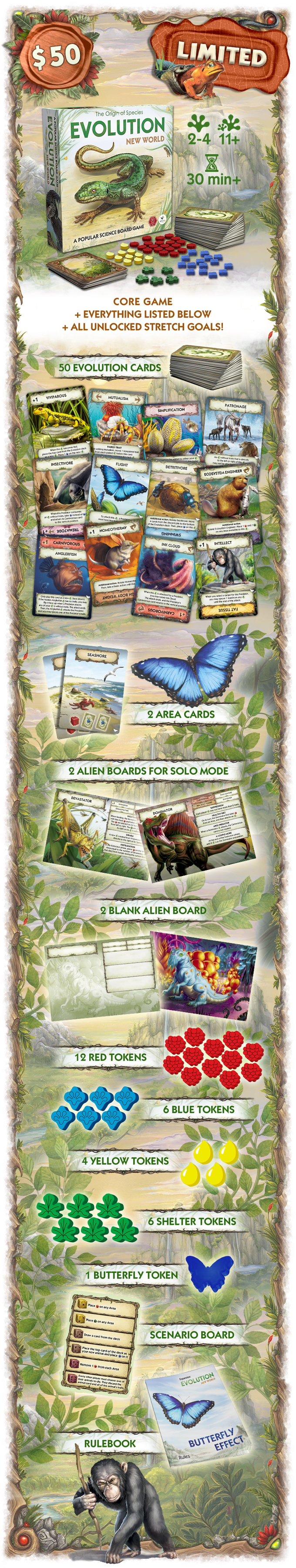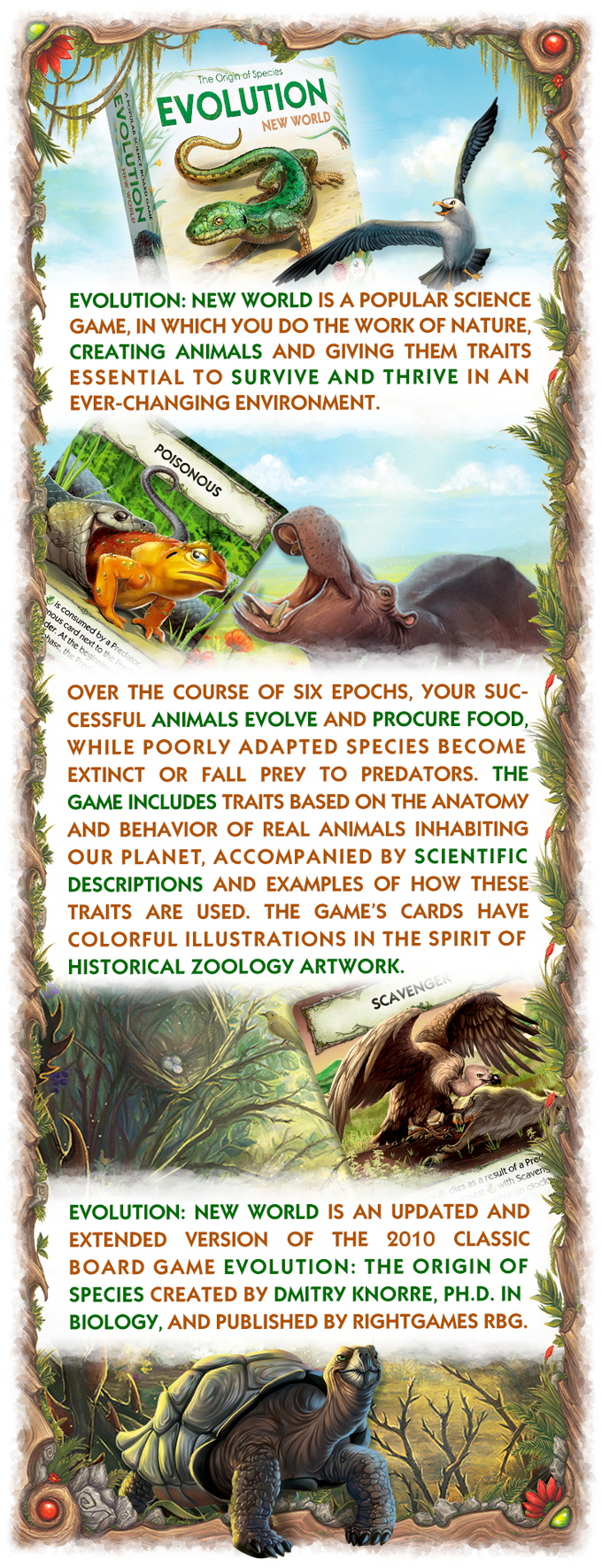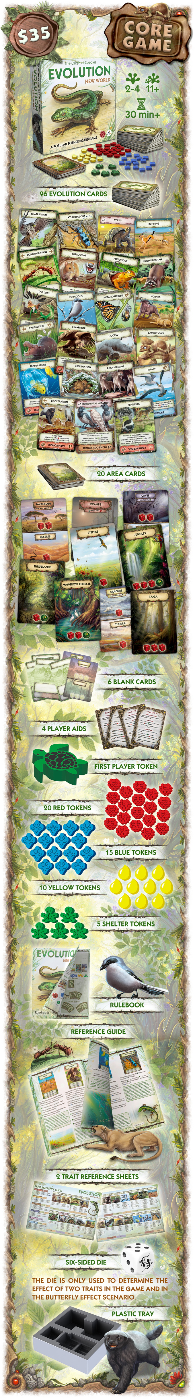 Evolution. New World is an updated and extended version of the basic Evolution. The Origin of Species game. It includes both well-known animal traits and new ones, complete with refined descriptions and colorful illustrations. Food is now generated using Area cards, and animals can use shelter to hide from predators.