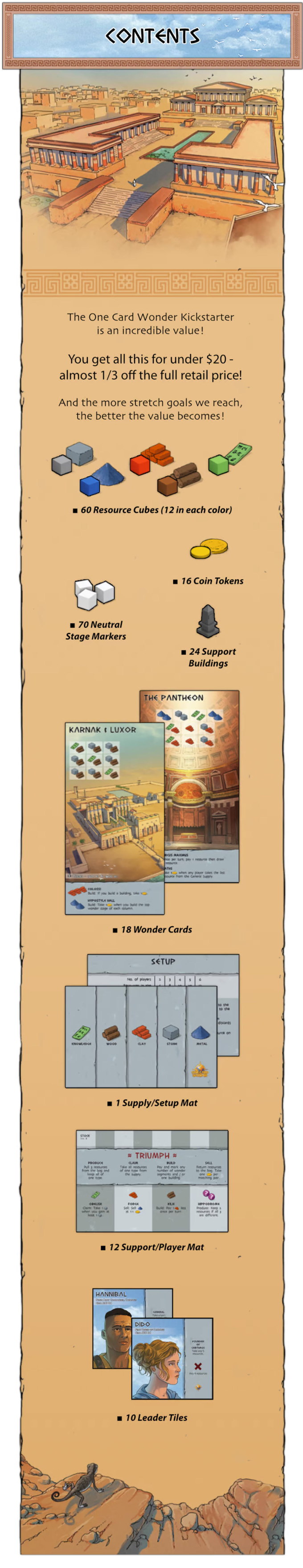 Each player receives a card depicting a Wonder of the ancient world that they must build in addition to a set of Support buildings that they may choose to build to help them as they build their wonder from the ground up. Each turn, players can: