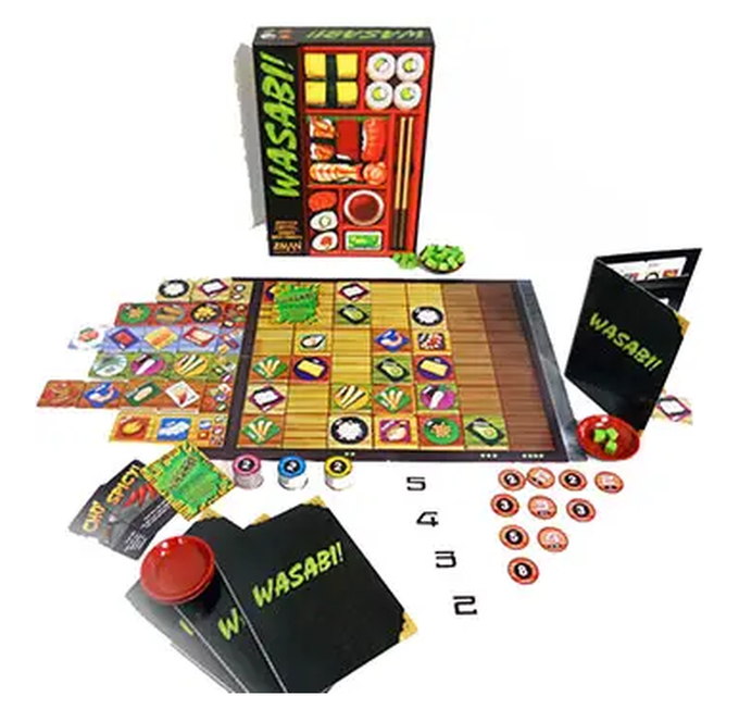 Wasabi! is a light and fast game where you compete against other players to assemble your quota of unique sushi recipes in a rapidly dwindling space. Players draw a variety of delicious ingredients into their hand from the pantry and play them one at a time onto the board, building off of each other's previously-placed ingredients in the attempt to complete recipes of varying difficulty.