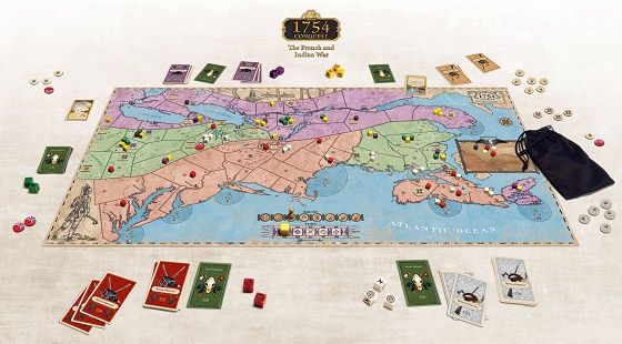 '1754 Conquest' is an area control game that continues the award-winning Birth of America Series. Players for each side work together in order to coordinate their strategies. To win, each side attempts to control Victory Spaces on the map that represents towns and forts. The militia players receive reinforcements from muster points while the French and English Regulars must ship their reinforcements from overseas. The game ends when the Treaty of Paris is signed and the side controlling the most cities wins the game.