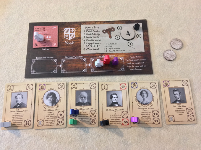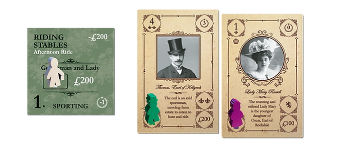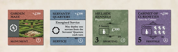 In Obsession, your country estate is represented by a series of game tiles describing rooms and outdoor spaces that have been renovated. These renovations enable the family to host social activities—Fox Hunts, Music Recitals, Formal Dinners, Grand Balls—all the while enhancing your family's reputation in the county and unlocking special abilities.