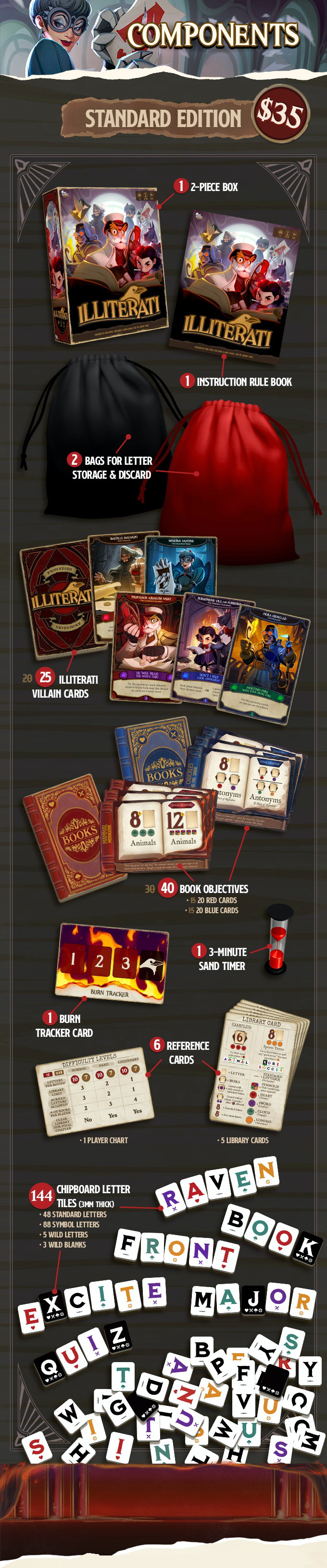 Illiterati is a real-time, co-operative word game in which players work together to form words and bind books. Each player starts the game with five letter tiles and a red torched book that shows a condition that player must achieve to restore that book, e.g. using 8+ tiles with at least 3 green symbols, create words that are all animals. A library of three random tiles is placed in the center of the table. The game takes place in three-minute rounds, and before the round begins each player draw seven letter tiles from the draw bag.