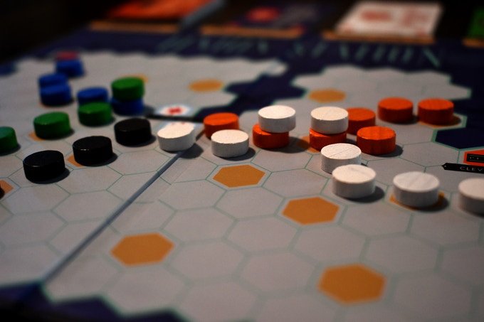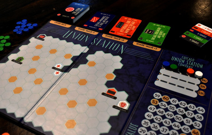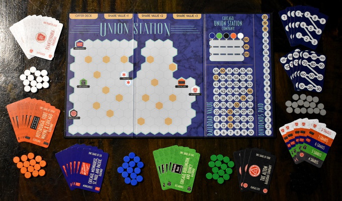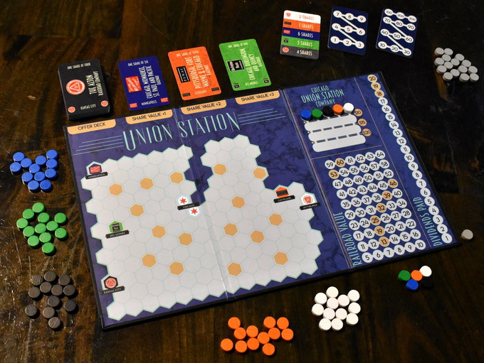 Union Station is a quick-playing cube rails game for 3-5 players, focusing more on share purchasing and stock manipulation than route building. On your turn you may either buy stock and increase its value, sell all of your stock to get quick cash while also lowering the company's value, or lay track. While the shares might come out randomly, it's all about careful timing and the willingness to drop something good for something even better.