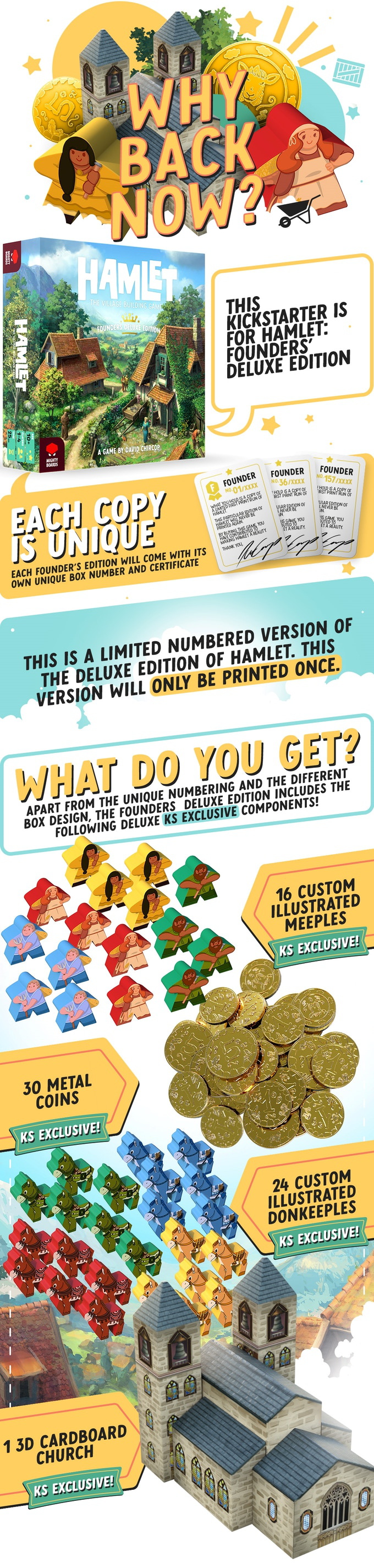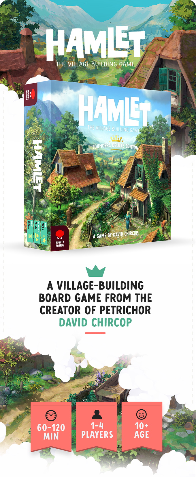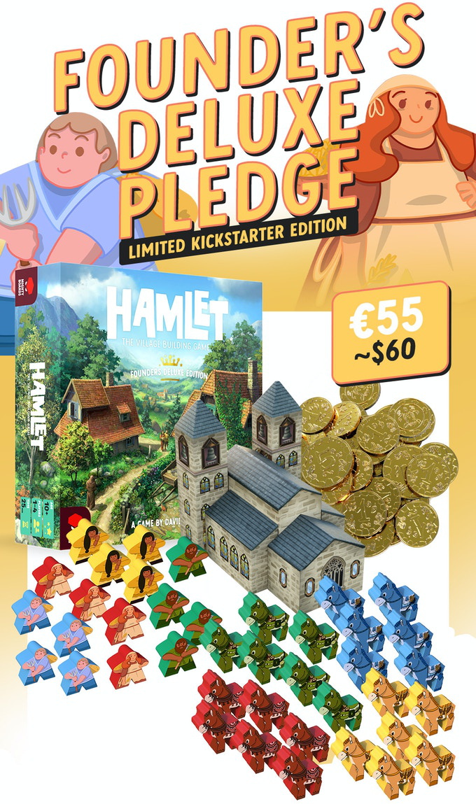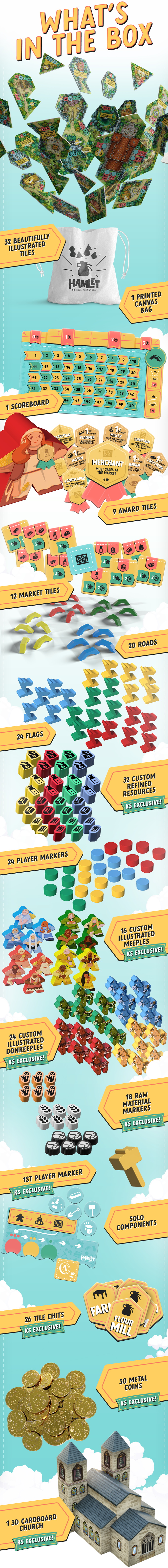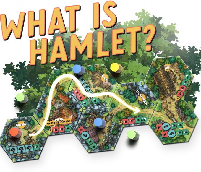Hamlet is a medium weight competitive village builder where players are communally turning their Hamlet into a bustling little town. In this tile placing game, players construct buildings that everyone can use to create materials, refine resources, earn money and make important deliveries to construct the Hamlet’s big landmark - the Church.
