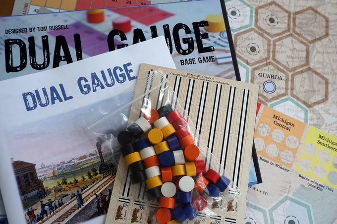 The title Dual Gauge refers to the fact that there are two kinds of track - standard gauge and narrow. Standard is more expensive and more efficient, while narrow gauge is cheaper and rather inefficient. These rectangular track tiles are laid across adjacent hexsides, and all companies are able to utilize a shared track network provided they are connected to it. Different types of track will of course call for different types of trains. Stock purchases put funds in the company coffers, and the company uses this money to pay for track. Trains, on the other hand, are paid for in stock value itself. Those trains can also be "rusted" by the purchase of newer models. Companies can also "token" station spaces on the map, increasing their routes while potentially blocking access for rivals. These, too, are paid for in stock value, by decreasing that value by an entire row in the game's capricious two-dimensional stock market.