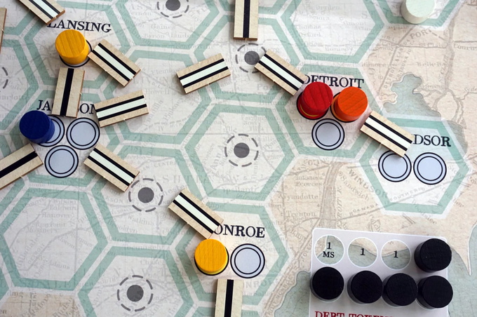 This is not only a game, but a game system played on multiple maps. Each map has unique twists, and a set of companies with unique asymmetric abilities. This base set gets the party started with two maps. Portugal is intended as an introduction to the system, but asks players to contend with difficult mountainous terrain. The challenging Detroit map, set in part of Michigan's Lower Peninsula, finds players taking on debt to keep underfunded railroads afloat, all with an eye toward reaching Chicago and its double-route bonus.