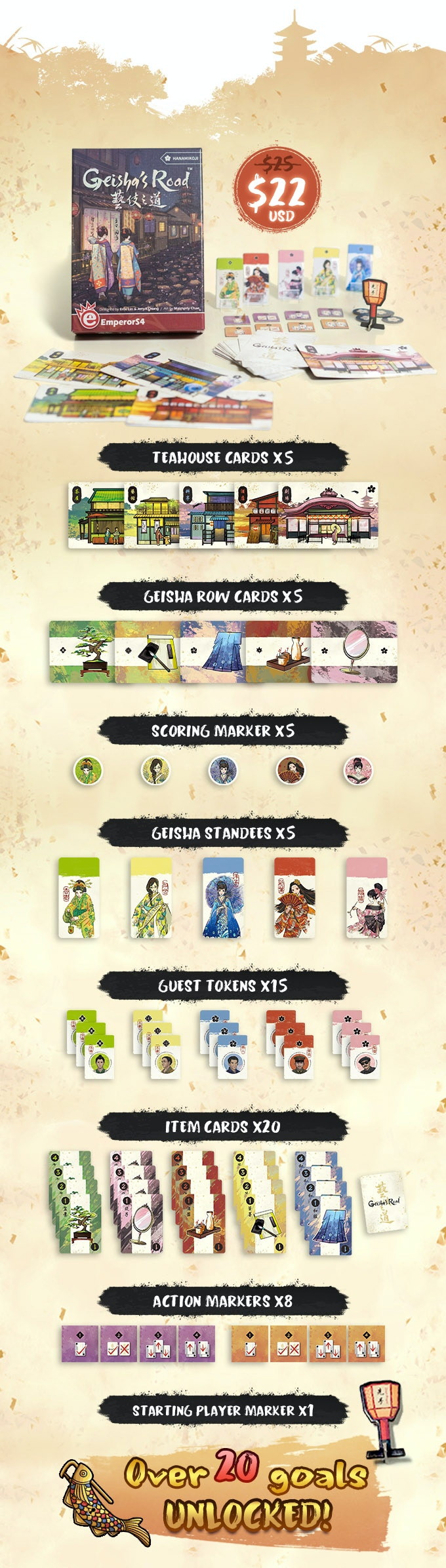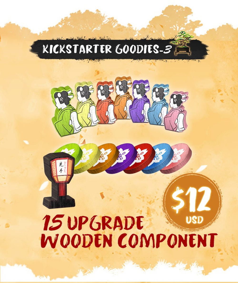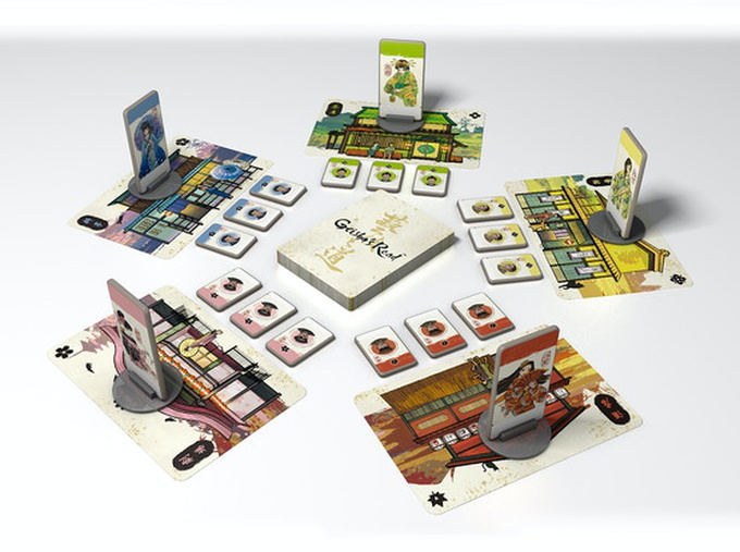 To do so, players help their favored geisha advance and build prestige through performing their art at different teahouses. Geisha start as apprentices (maiko) but become full geisha and score prestige points after accruing the necessary patronage to return to their original teahouse (ochaya) for the graduation ceremony (erikae). Some geisha may continue their path further and eventually inherit the teahouse (upon a second return) to become the new okaasan, recognized with more prestige points.
