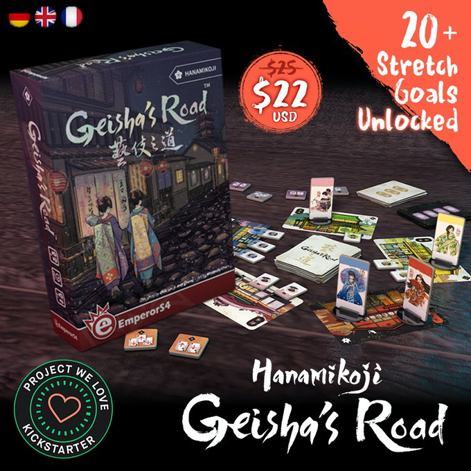 In Hanamikoji: Geisha's Road, a 30-minute two-player, competitive strategy game full of implicit intentions, veiled messages, and hidden actions, players represent rival but friendly patrons supporting Yoko, Tomoyo, and others along their journey from apprentice (maiko) to full geisha (artist) and perhaps even the owner (okaasan) of their own establishment.