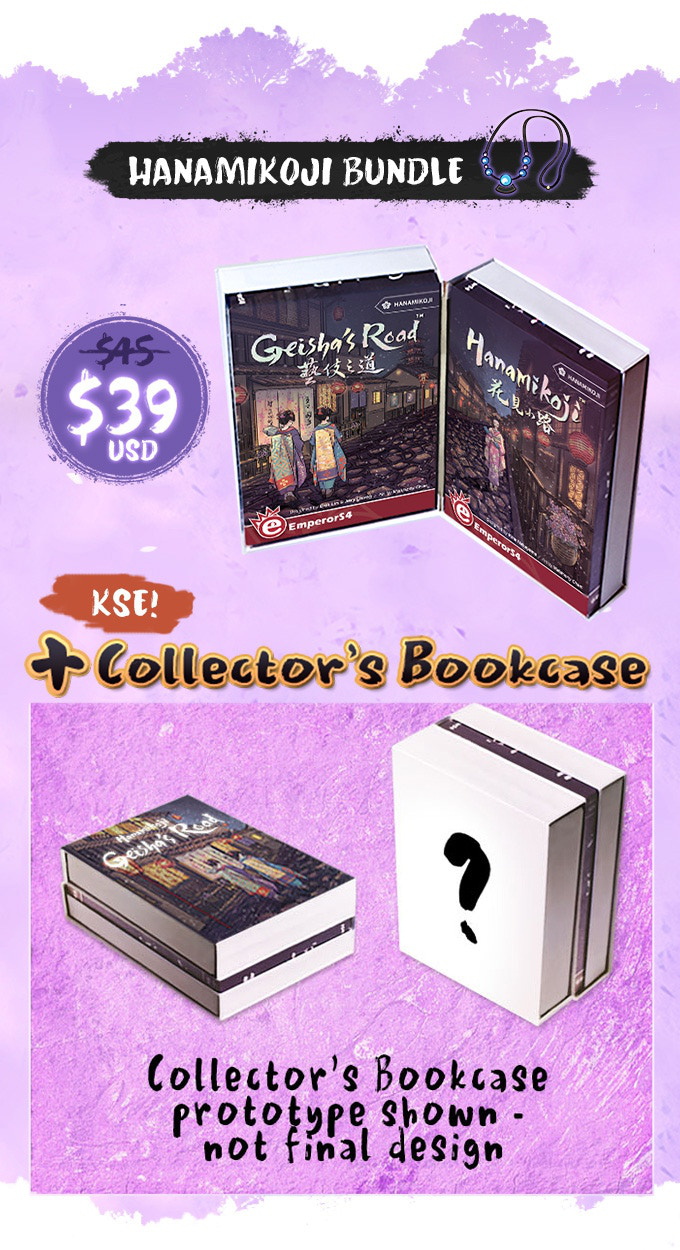 *The Collector's Bookcase (the white mock-up case in the image) is a Kickstarter-Exclusive (KSE) gift for backers who pledged Hanamikoji Bundle or above during this campaign. It's a one-piece foldable cardboard case that can hold both games in place. You can fold it for portability or open it to showcase the beautiful artwork by the artist Maisherly on your game shelf.