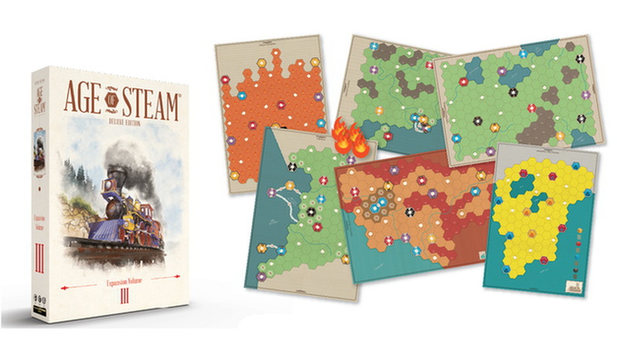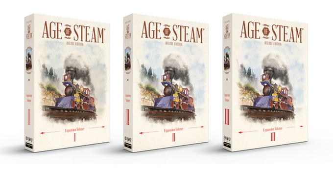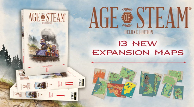 It's time to stoke the engines and polish your locomotives with these 3 Expansion Volumes for Age of Steam Deluxe! In total, the 3 volumes contain 21 Expansion Maps including updated versions of classic Age of Steam maps adapted to the new Deluxe style and some new maps which have never before been published! Each Expansion Volume also includes a storage box to store the maps, making it easier to keep them organized!