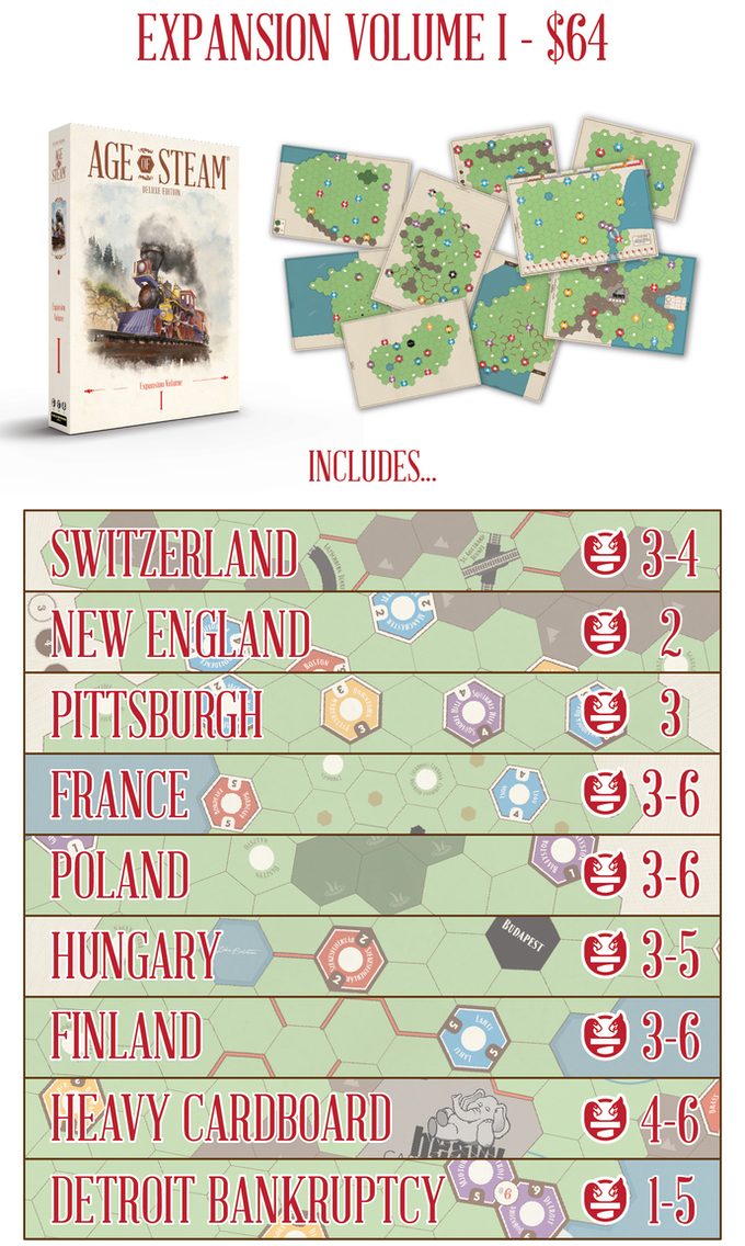 Expansion Volume I includes all of the previously released Age of Steam Deluxe expansion content not found in the base game including previous Stretch Goal maps. Each of these expansions in Volume I are also available separately.