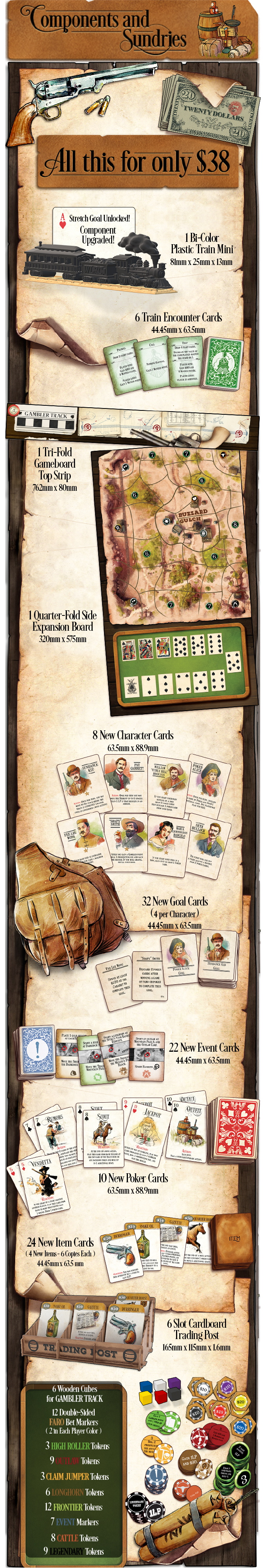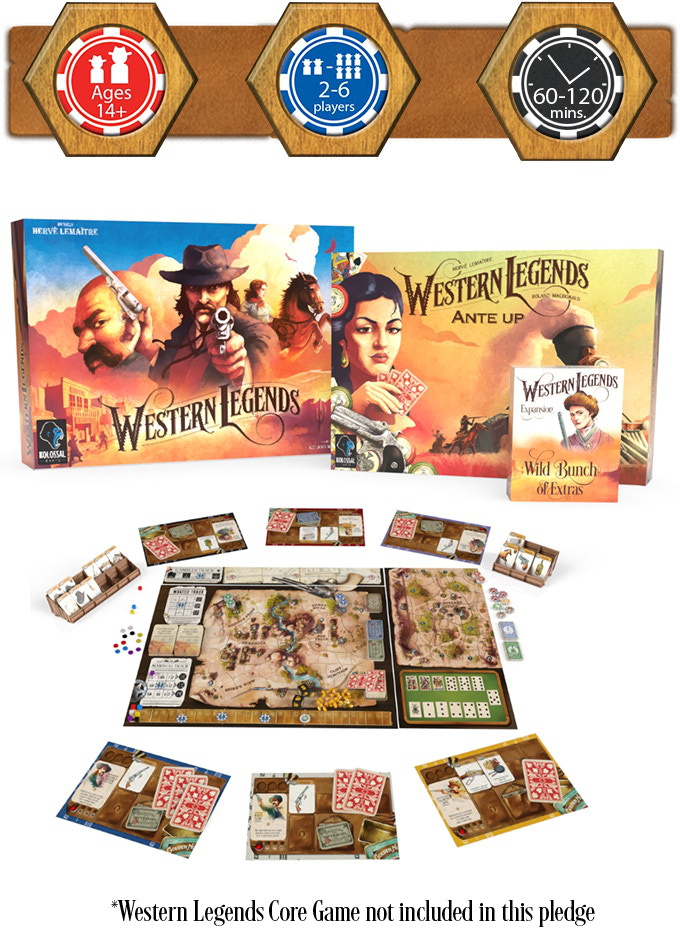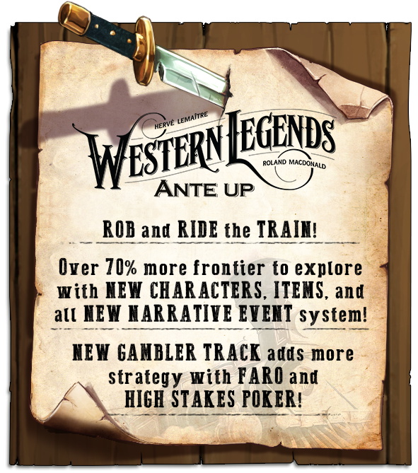 Ante Up is the first big box expansion to the award-winning, Western Legends. The Western Legends: Ante Up expansion raises the stakes with new features such as the mini-game Faro, a train that travels the boards for unlawful players to rob, and much more. Ante Up also adds new characters, items, Man in Black cards, and Poker cards to mix or replace content from the original game.