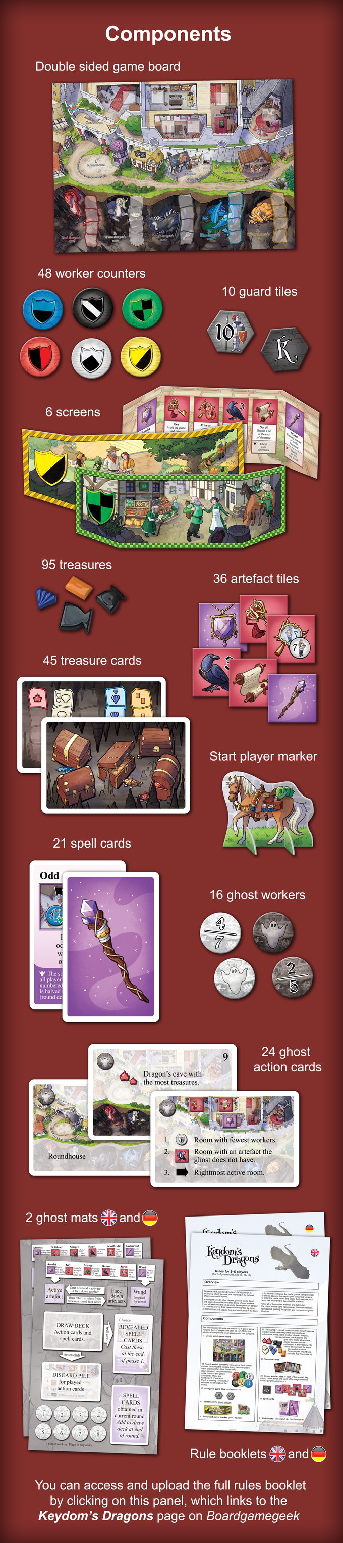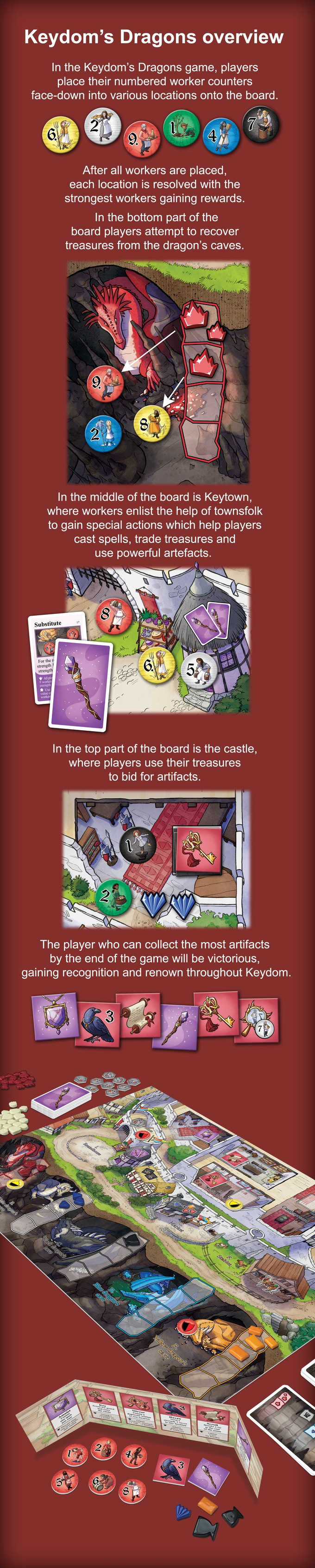 In competition with other players, in Keydom's Dragons you lead a band of eight plucky townsfolk (workers). You will send some of your workers into the caves while the dragons are abroad in order to recover their treasure hoards piece by piece. Other workers will acquire help and assistance in the town, or attempt to find a way past the castle guards using strength or bribes, opening the way for your remaining workers to enter the castle rooms and spend the treasures your team has recovered to buy valuable artefacts.