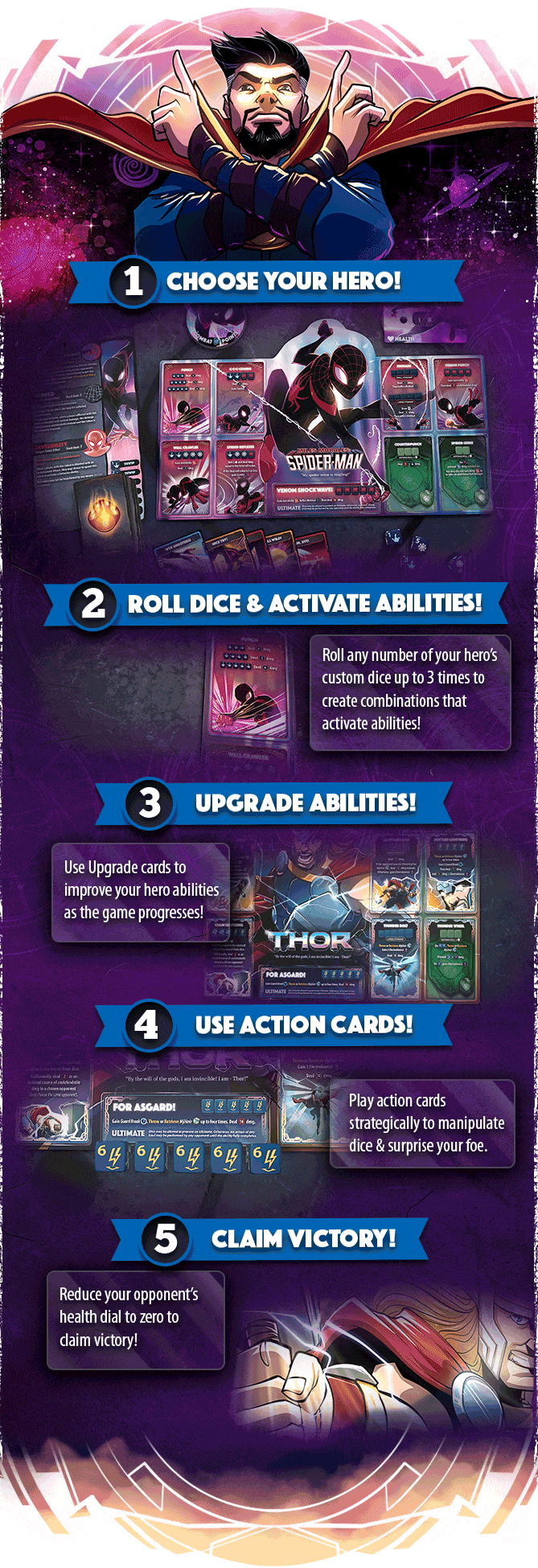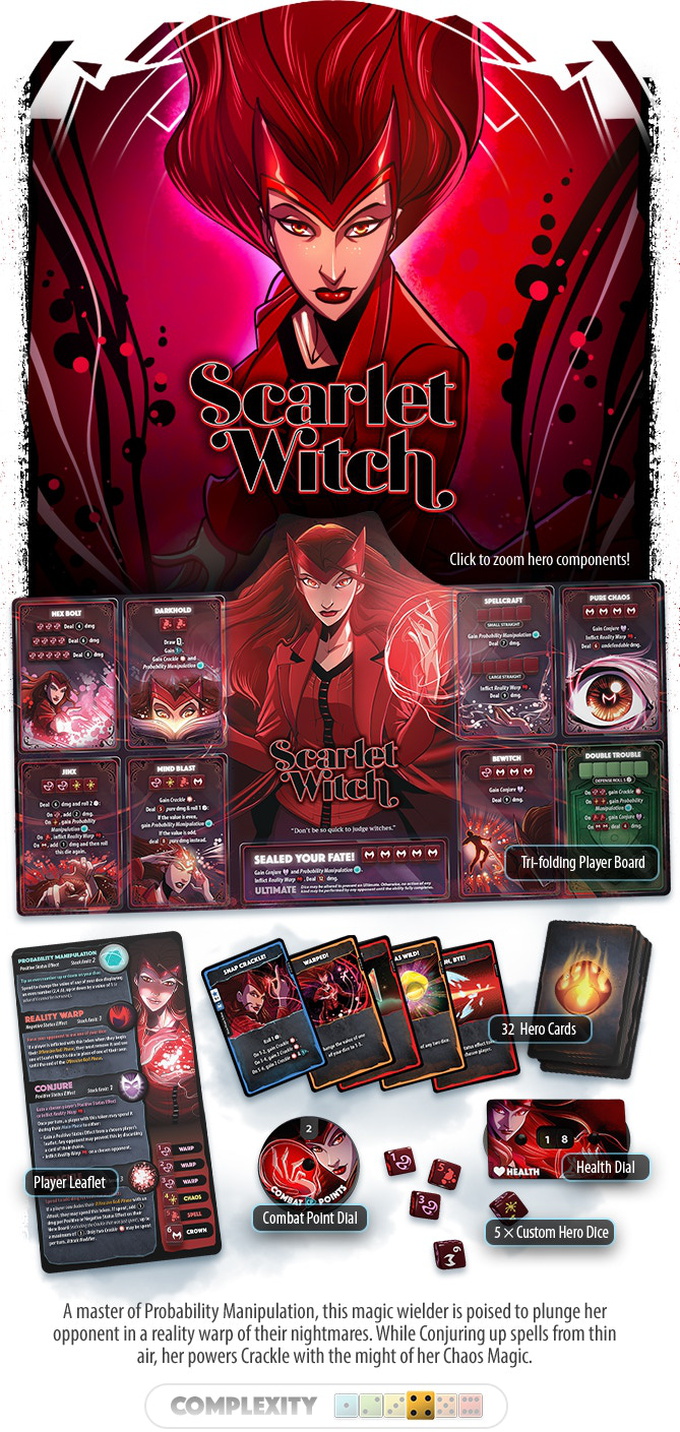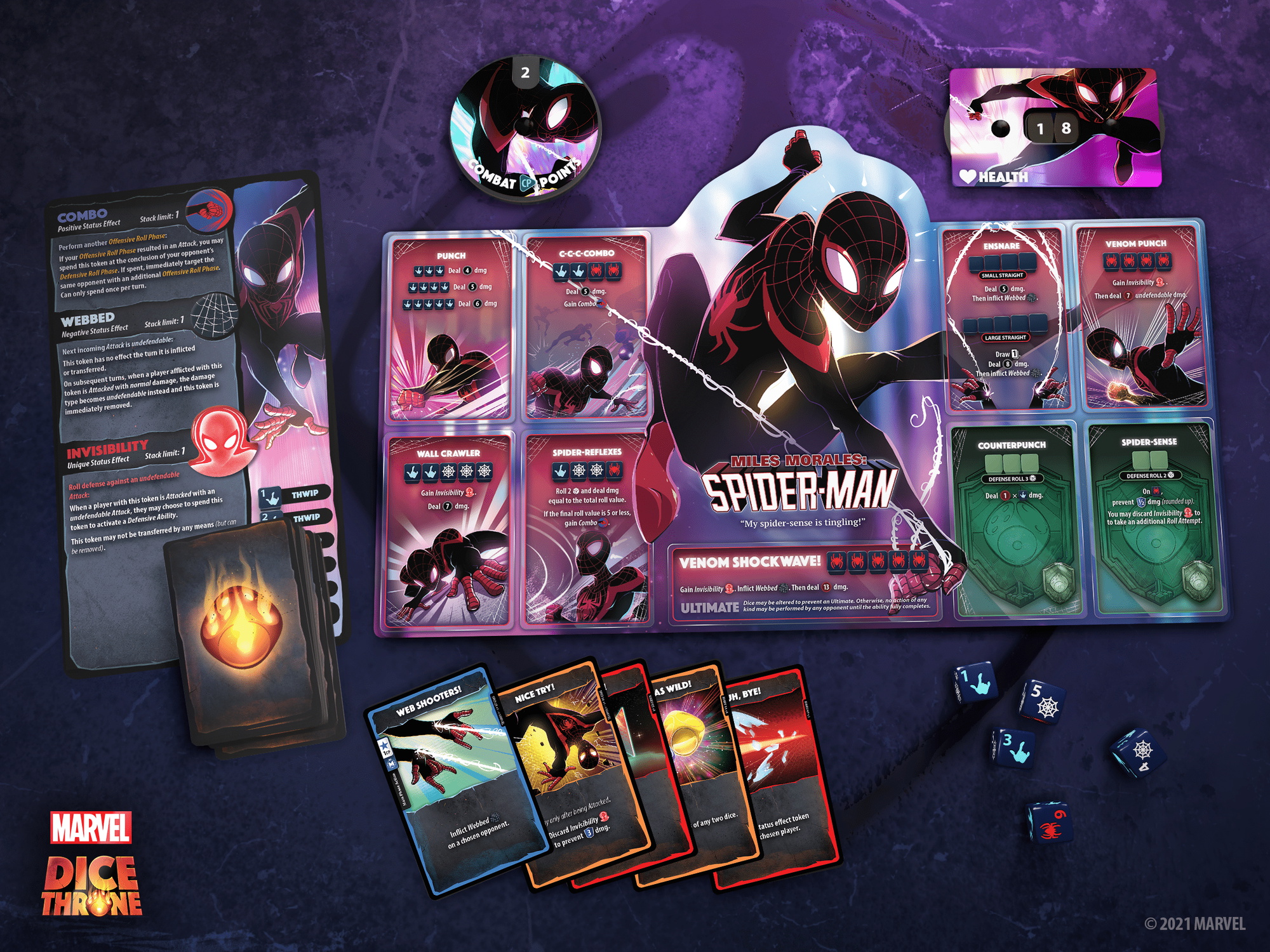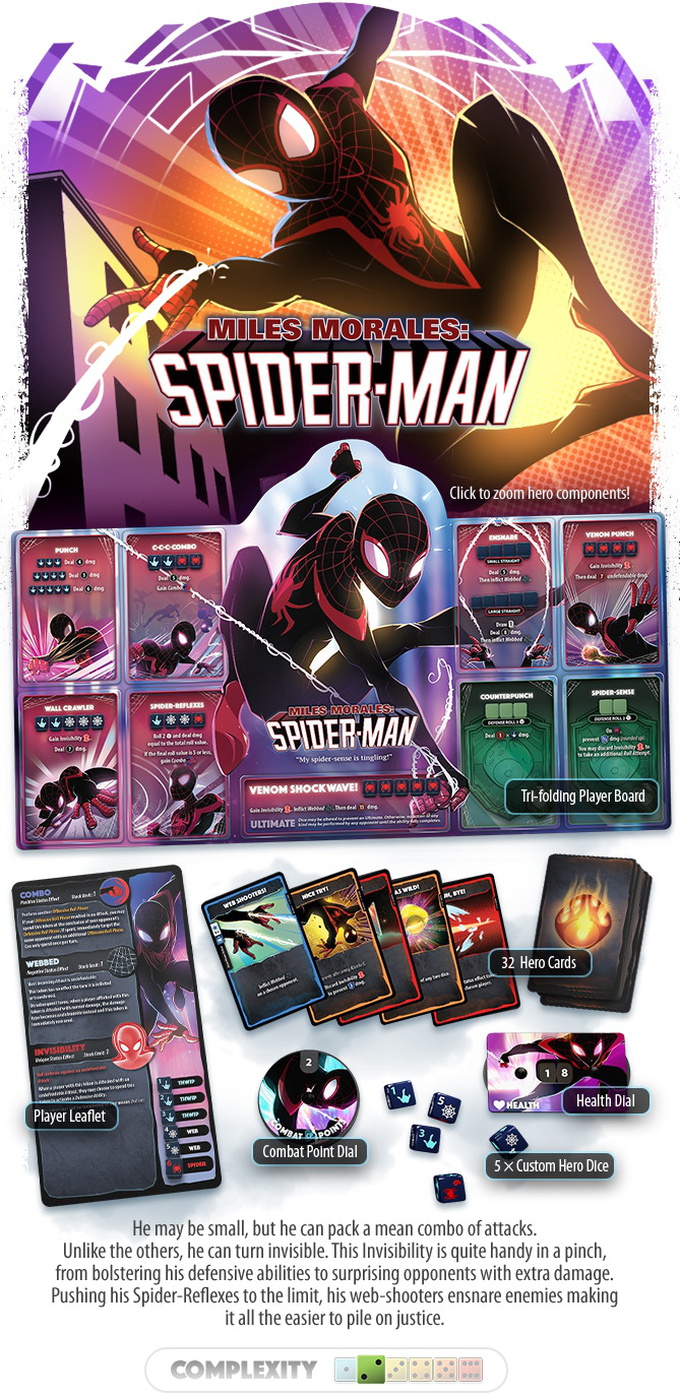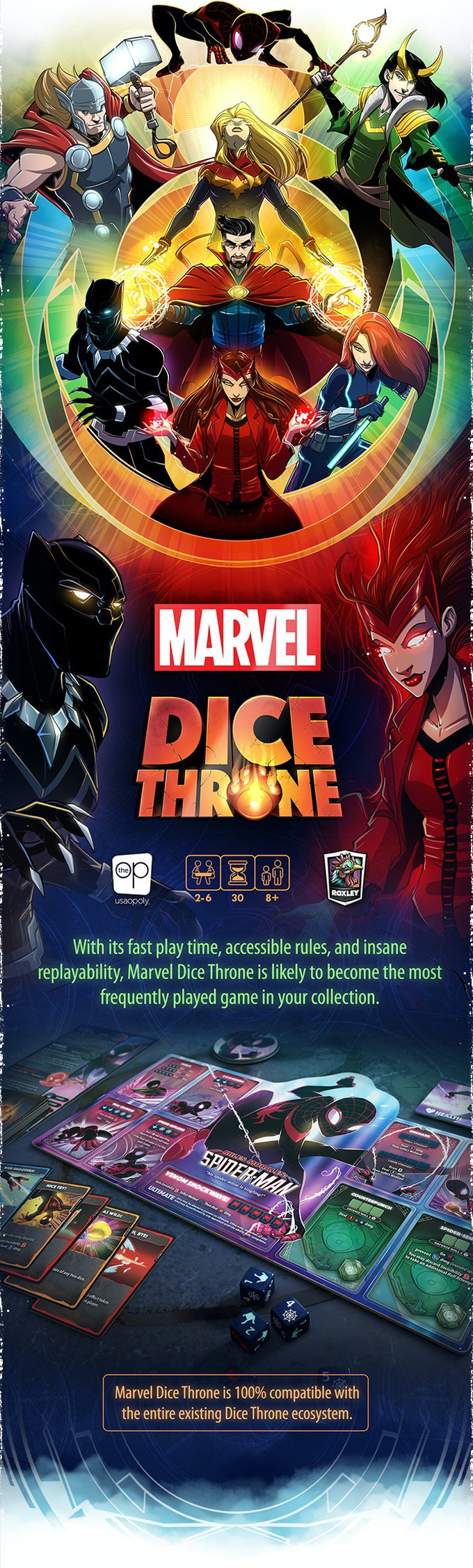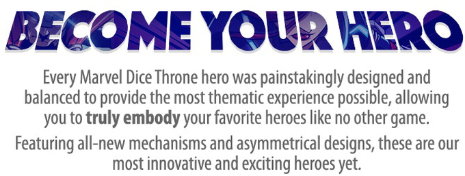In Marvel Dice Throne, you become one of eight of Marvel's most famous heroes, including Black Panther, Captain Marvel, Black Widow, Scarlet Witch, Loki, Thor, Doctor Strange, and Miles Morales Spider-man! Every Marvel Dice Throne hero was painstakingly designed and balanced to provide the most thematic experience possible, allowing you to truly embody your favorite heroes like no other game. Featuring all-new mechanisms and asymmetrical designs, these are our most innovative and exciting heroes yet.