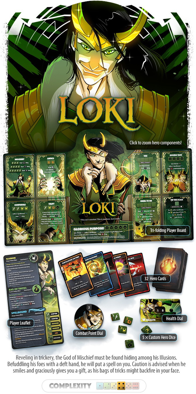 Attack your opponents and activate abilities by rolling your hero's unique set of five dice. Accumulate combat points and spend them on cards that have a large range of effects, such as granting permanent hero upgrades, applying status effects, and manipulating dice directly (yours, your teammate's, or even your opponent's).